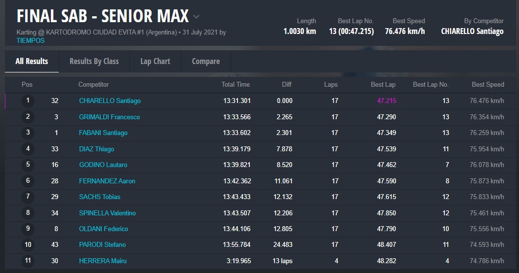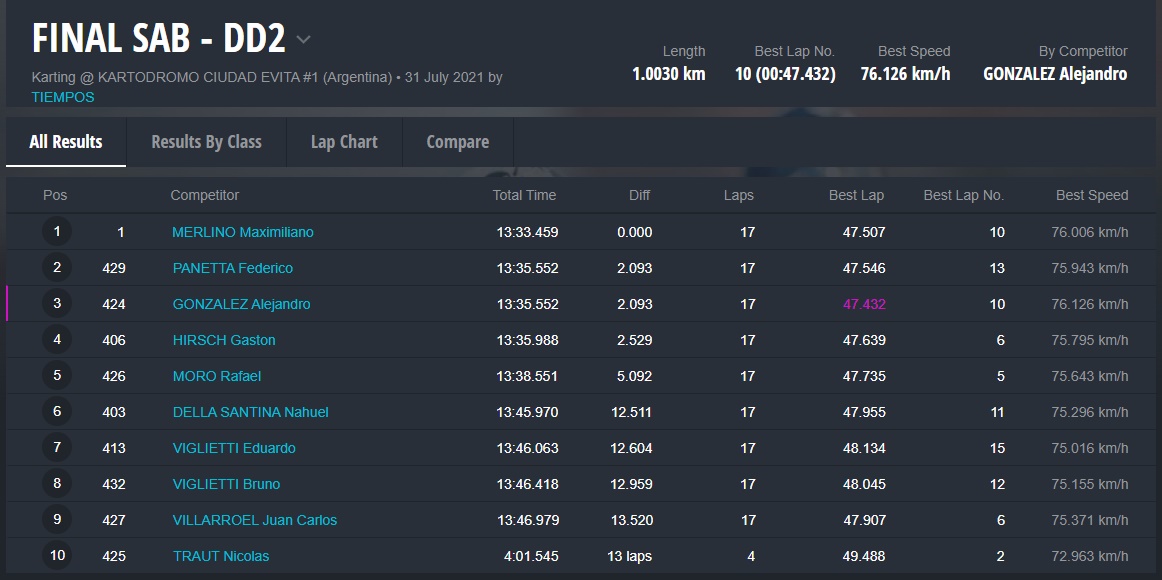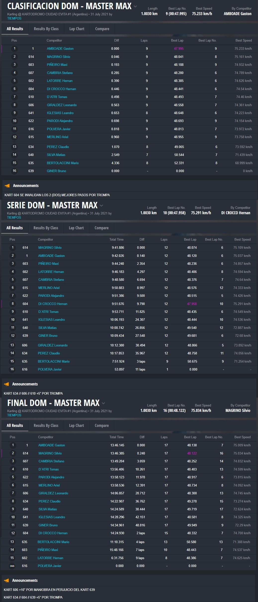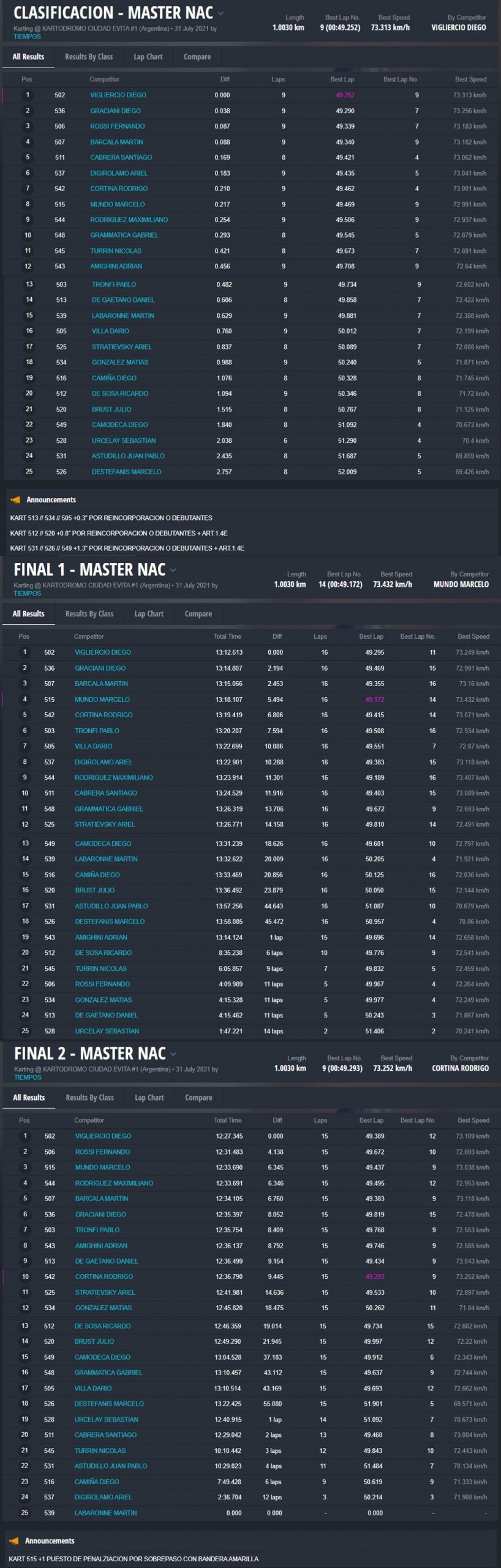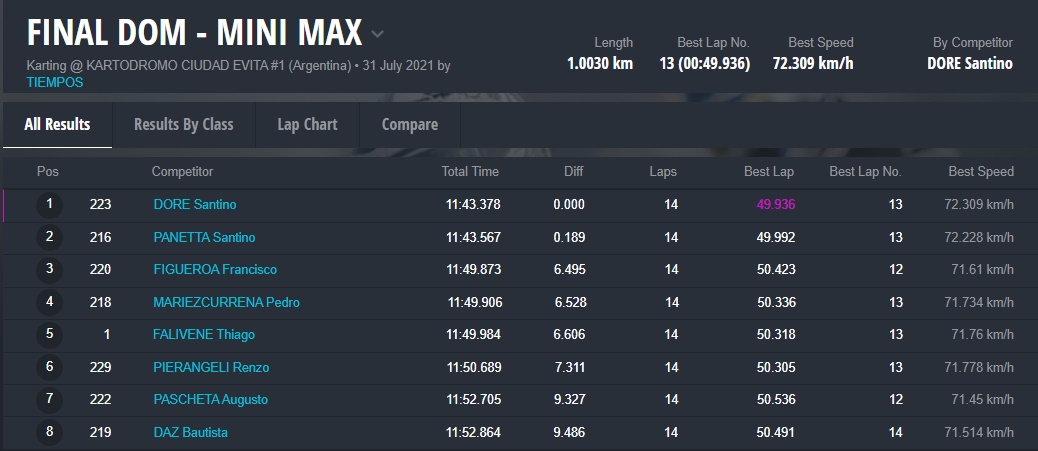El día DOMINGO ganaron Fausto Arnaudo (Micro), Santino Dore (Mini), Santiago Biagi (Junior), Santiago Fabani (Senior), Gastón Amboade (Master) y Braian Quevedo (DD2). Ignacio Méndez Liñan (Senior Nacional) y Diego Vigliercio (Master Nacional) ganaron las dos finales que disputaron cada uno.