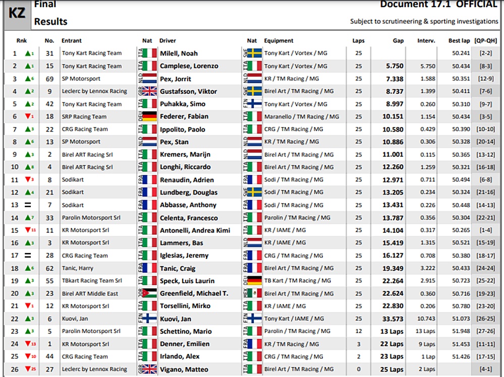 El italiano Matteo Vigano (Birel ART) era el favorito para el título KZ luego de sus tres victorias en las mangas, pero el sueco Noah Milell (Tony Kart) tomó inmediatamente la delantera desde el comienzo de la final, mientras que su rival italiano una vez más se vio afectado por la mala suerte y tuvo que retirarse en la primera vuelta.