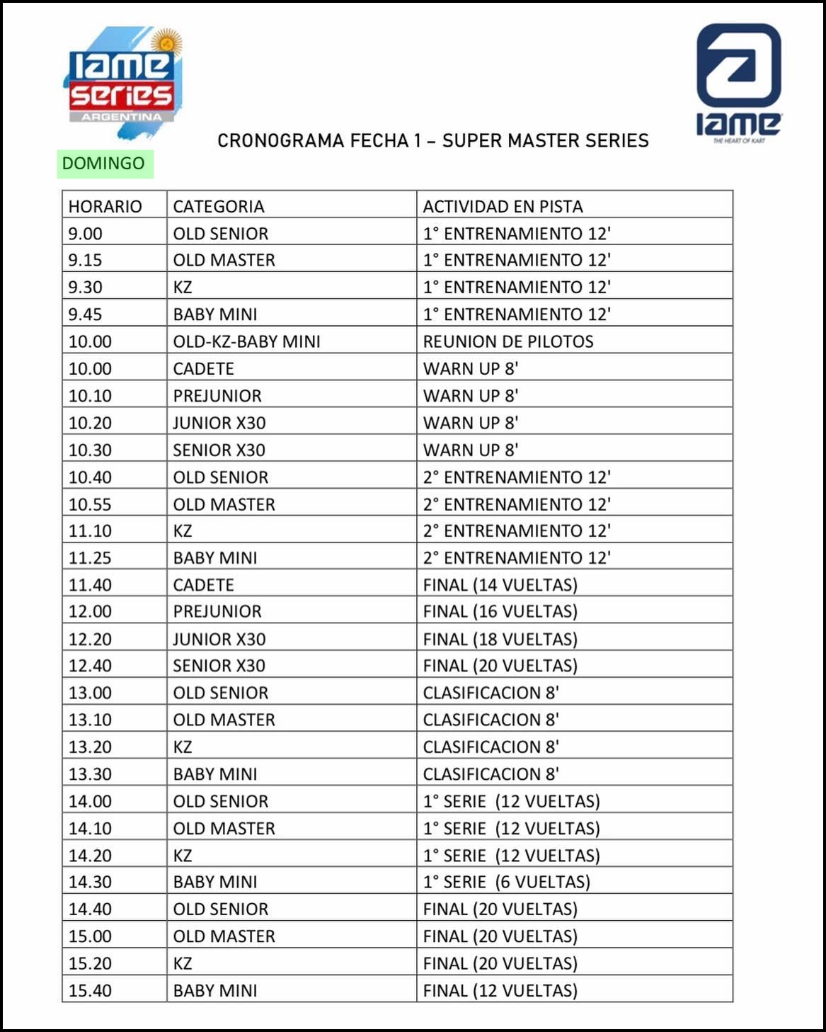 Cadetes, Pre Junior, Junior X30 y Senior X30 competirán sábado y domingo. La Proam junto con la Baby Mini competirán el sábado únicamente, mientras que KZ, Old School Senior y Old School Master tendrán toda su actividad únicamente el domingo.