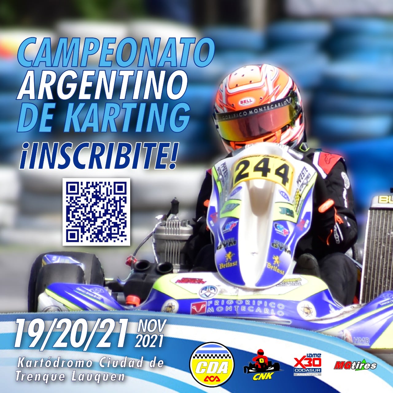 Comisión Nacional de Karting informó que se encuentra abierta la inscripción para la postergada fecha del Campeonato Argentino de Karting 2020 que se realizará los días 19, 20 y 21 de noviembre en el flamante kartodromo de la ciudad de Trenque Lauquen, ubicada a 445 kilómetros de la Ciudad Autónoma de Buenos Aires.