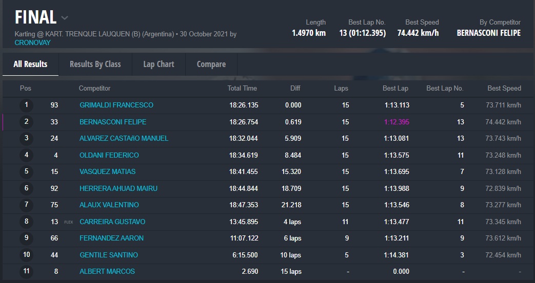 Con estos resultados, el misionero “Chicho” Grimaldi (Zaffaroni Kart) se consagró campeón Senior Max y obtuvo el ticket para participar de la Grand Finals Rotax que se realizará del 11 al 19 de diciembre en Bahrein, en Medio Oriente.