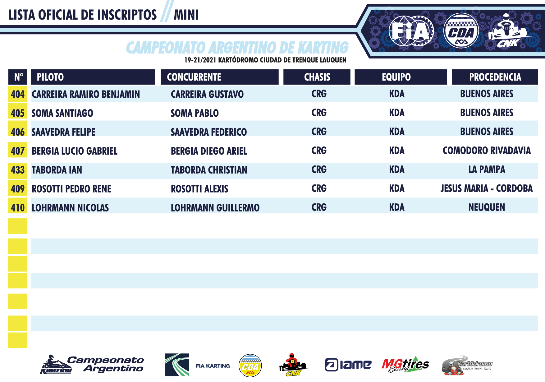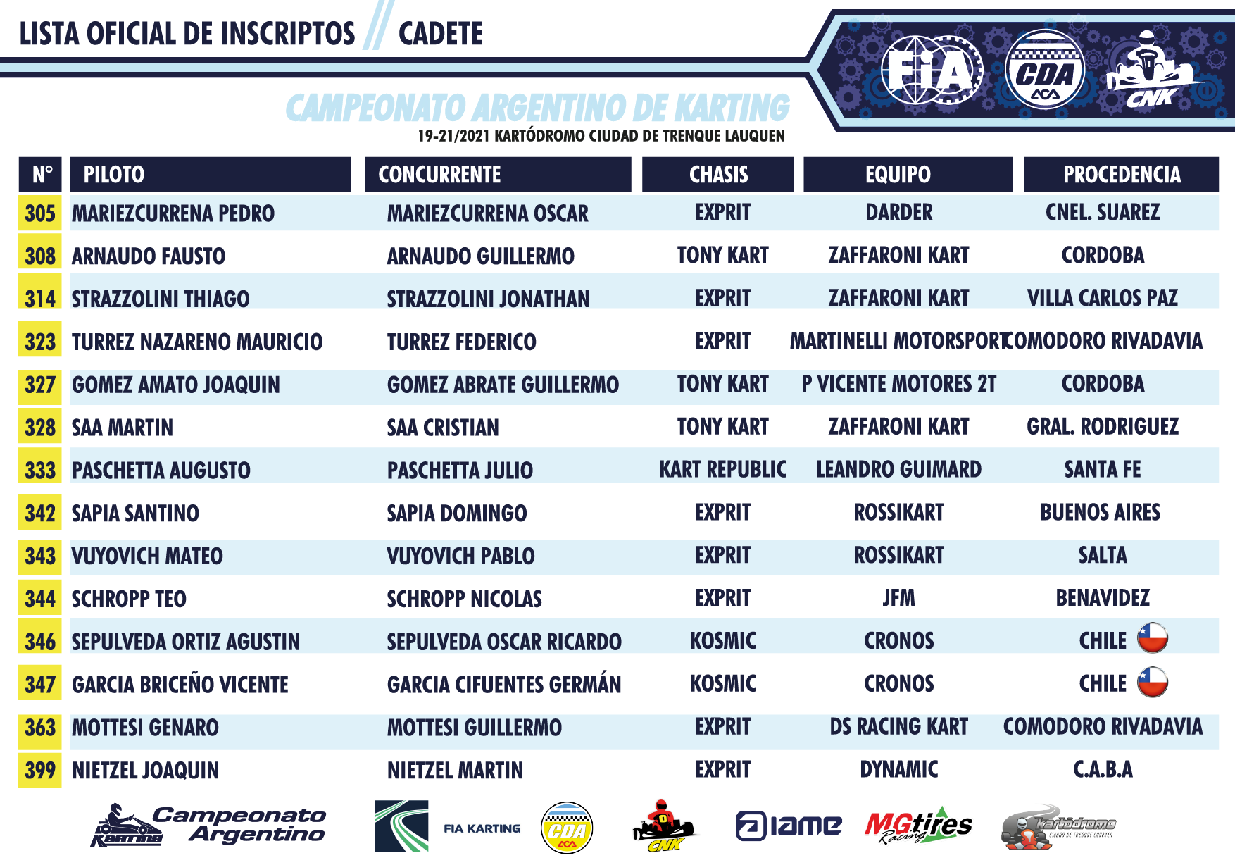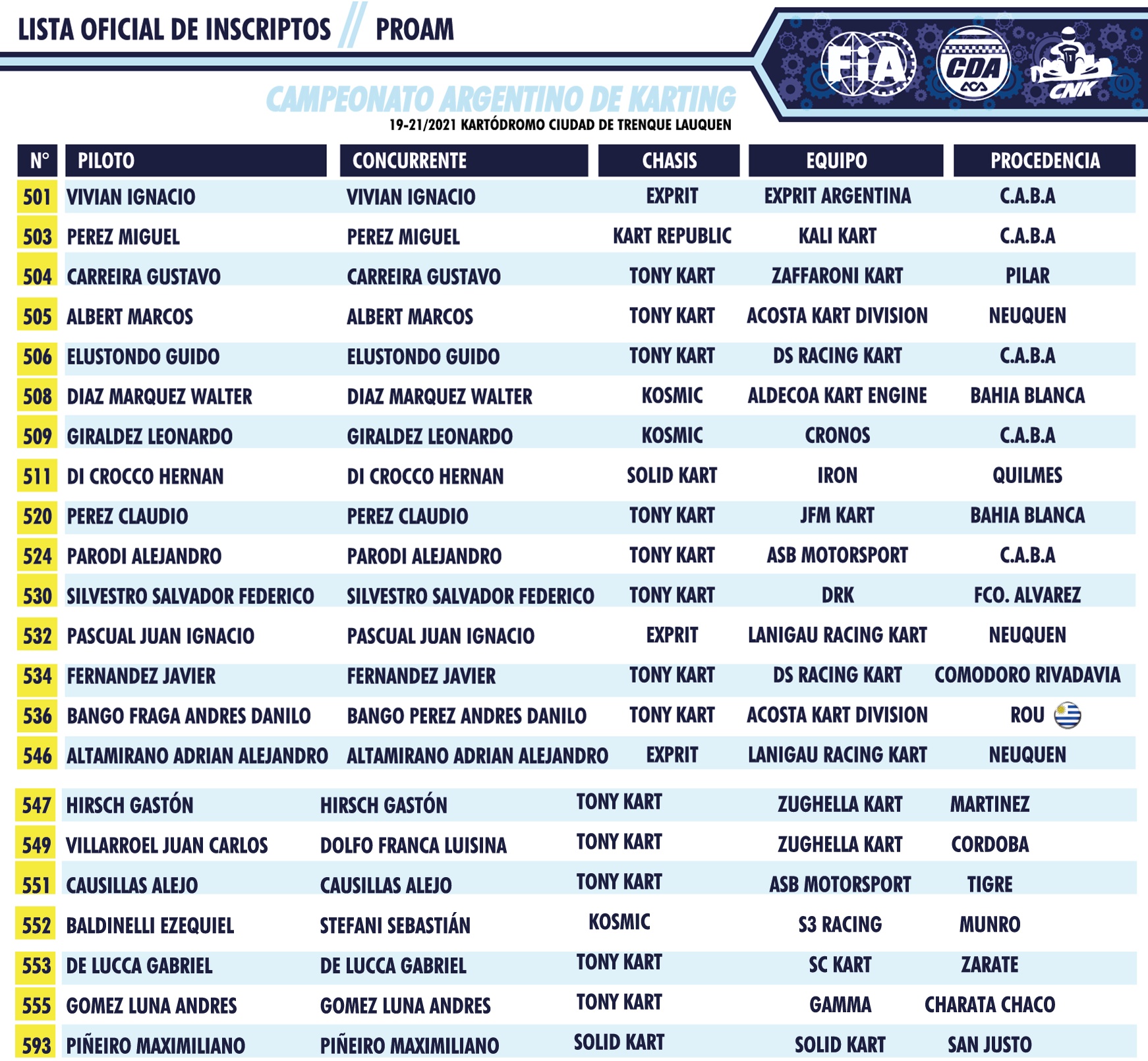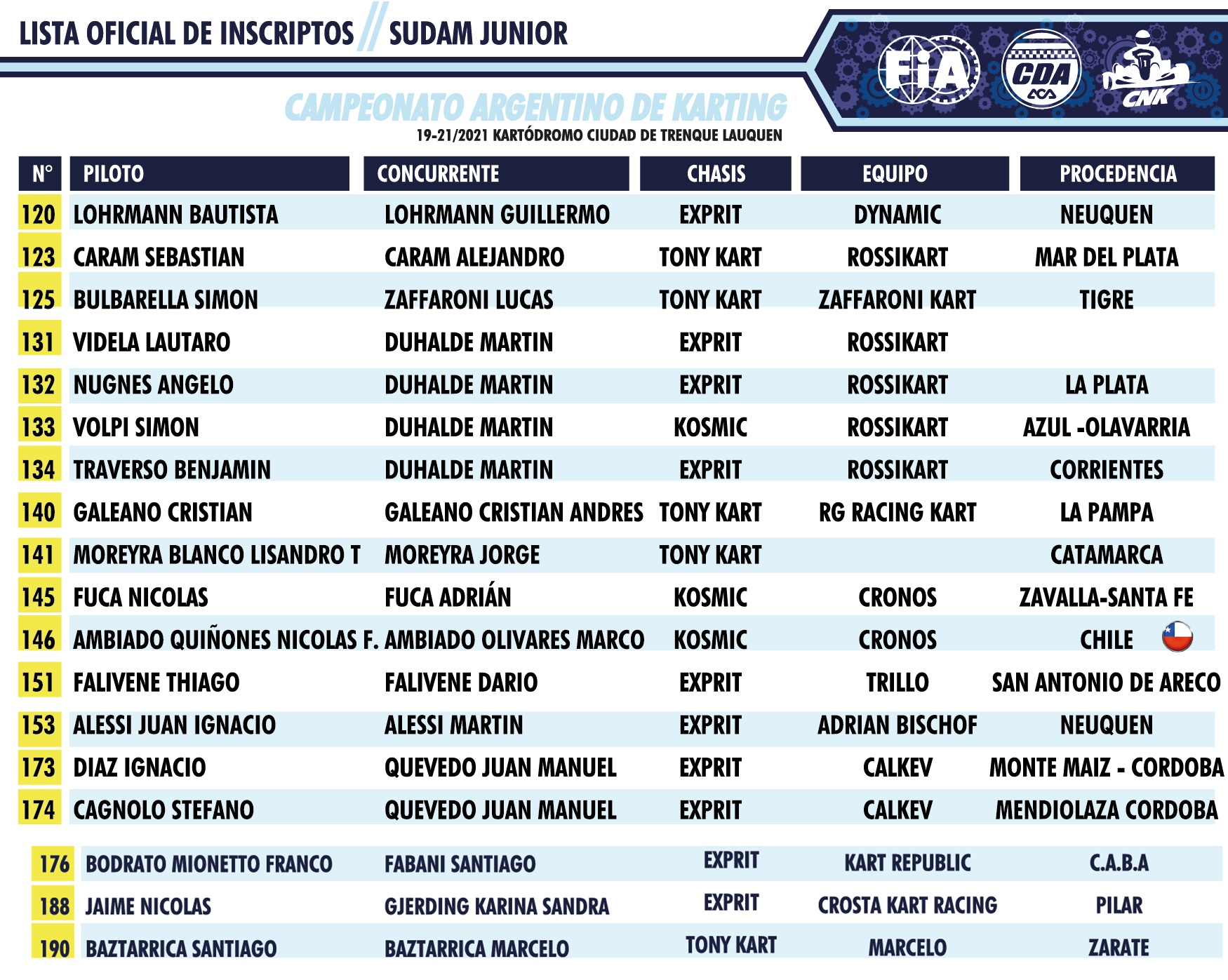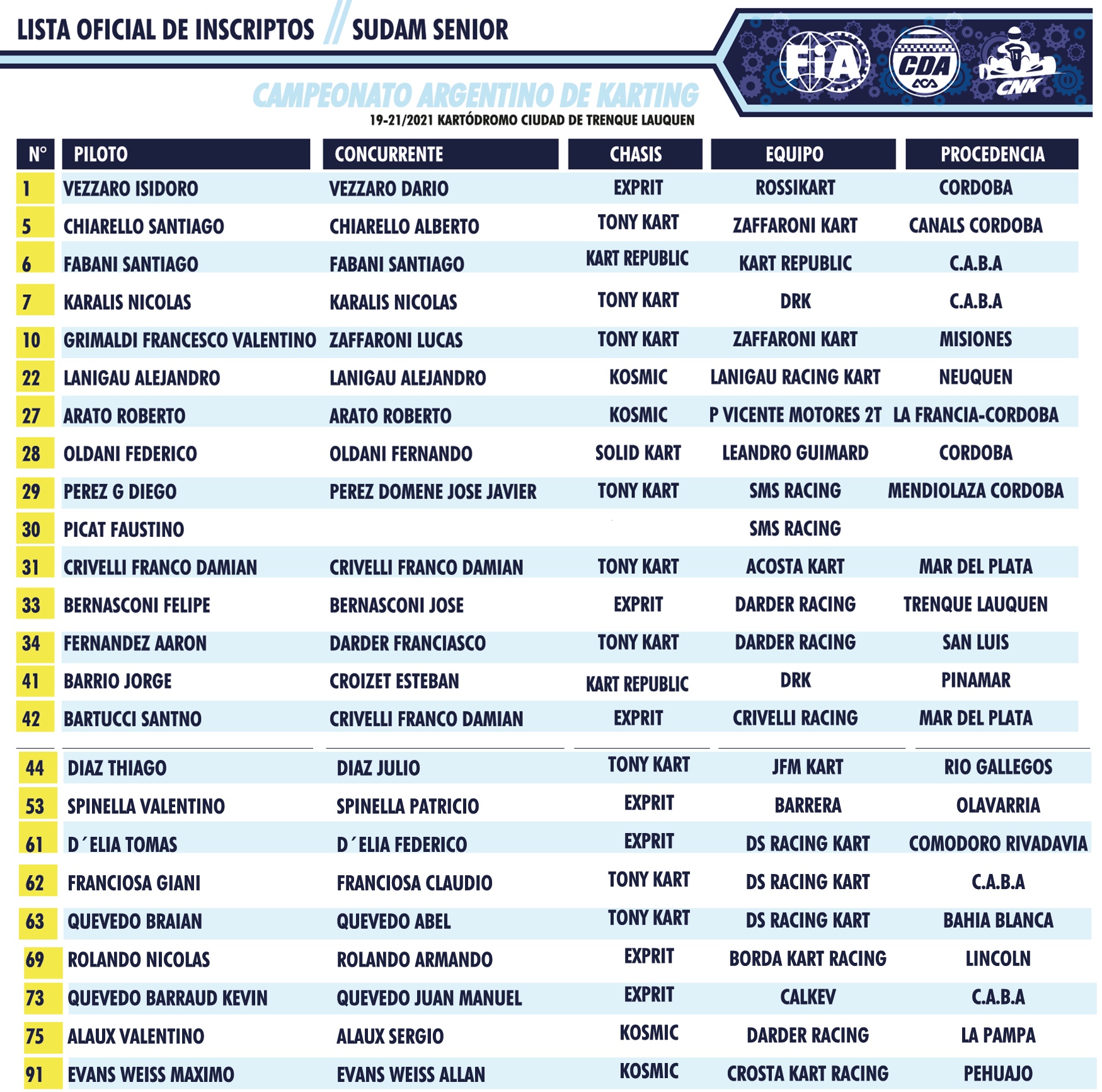 Esta tarde la Comisión Nacional de Karting dio a conocer los inscriptos que suman 85 pilotos, distribuídos de esta forma:
