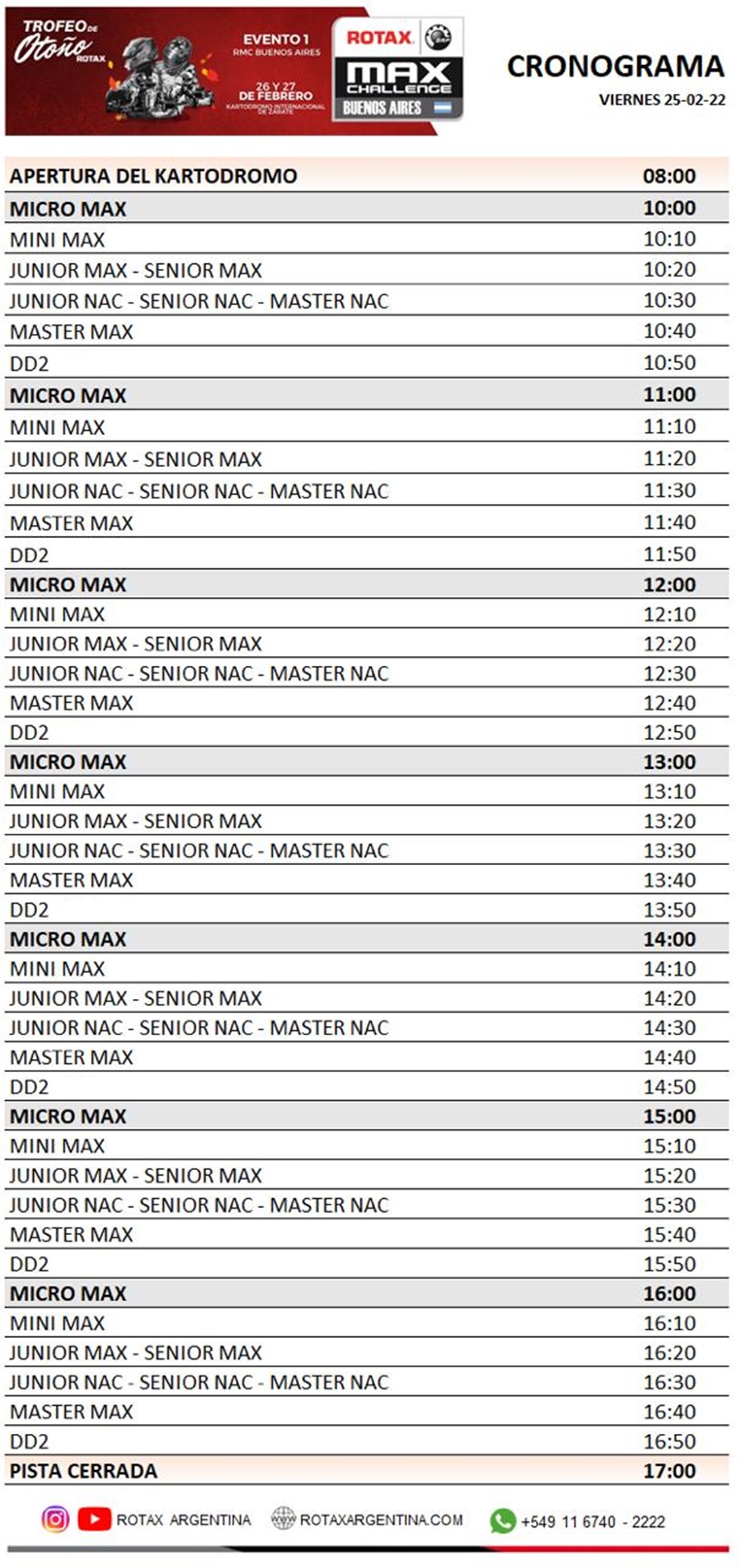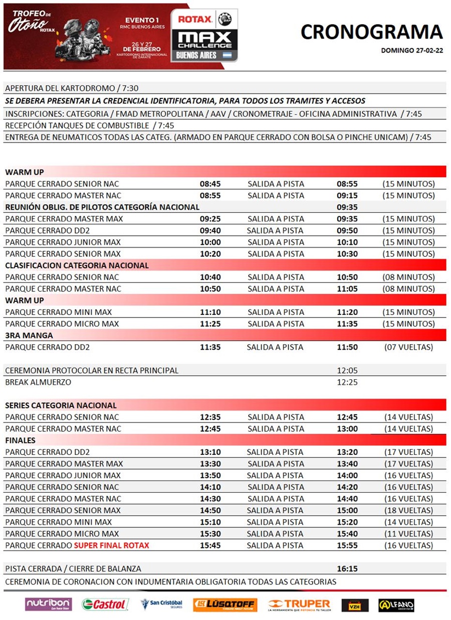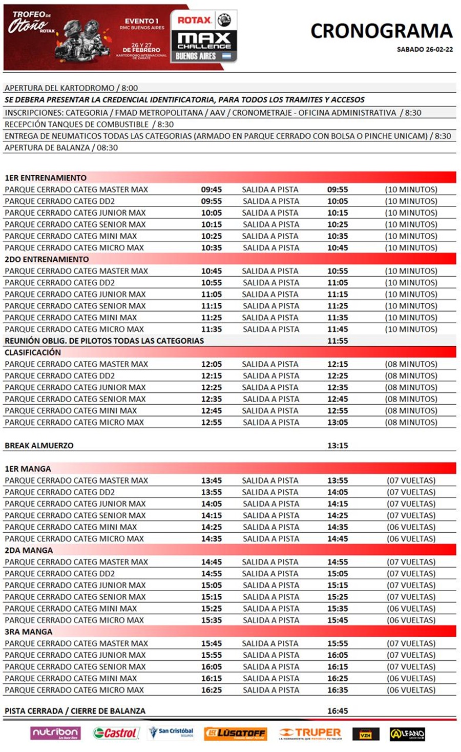 La actividad se centrará mucho más el día sábado, teniendo la mayoría de las categorías sus prácticas, clasificación y 3 mangas ese día. El domingo irán las finales, la actividad completa de las “Nacionales” y se cierra el espectáculo con la Súper Final Rotax.