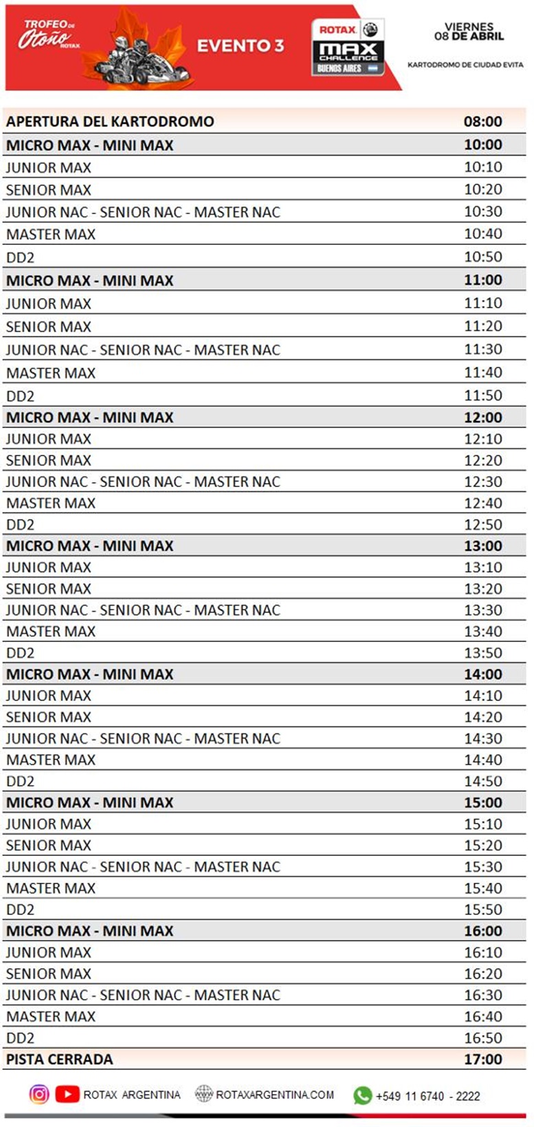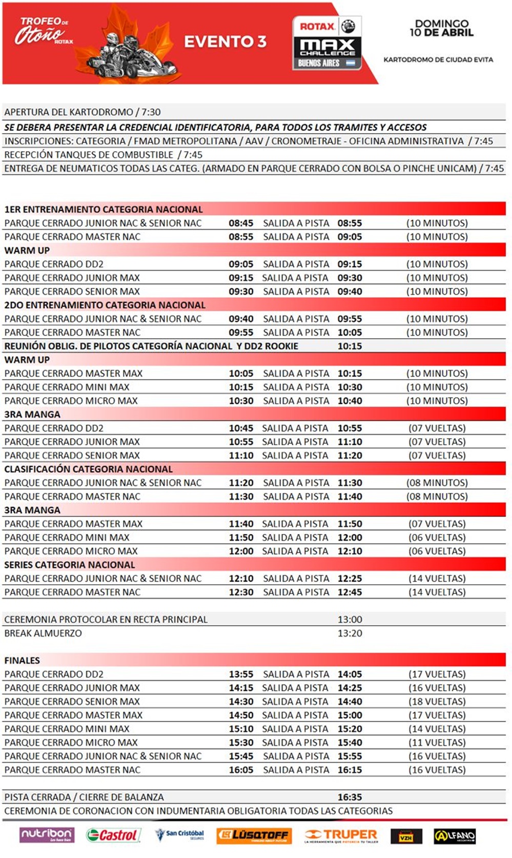 A las 13:55 horas comenzarán las competencias finales con transmisión “en vivo” por el canal de YouTube de Rotax Argentina. La jornada se cierra con los podios cerca de las 16:30 horas.