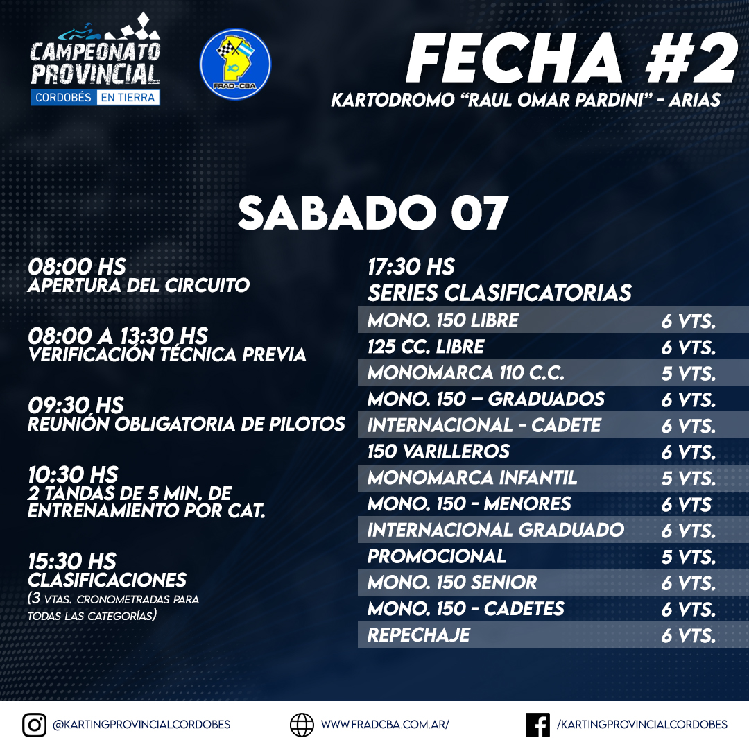El evento dará comienzo este Viernes desde las 17hs con la apertura de inscripciones. El sábado a las 8hs. se reinician las Verificaciones Previas, a las 10,30hs. los entrenamientos, y a partir de las 15:30hs. las clasificaciones de las distintas categorías.
