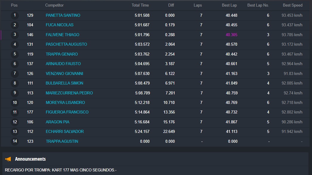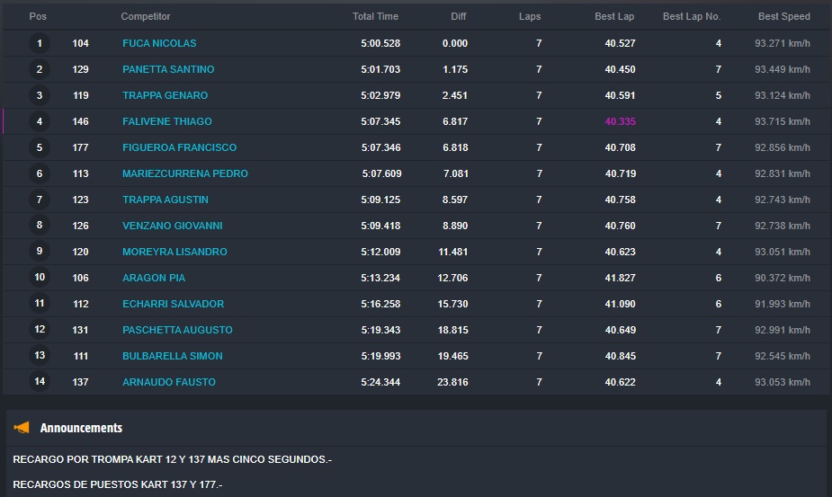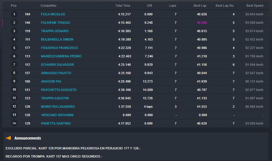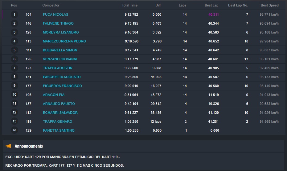 En la JUNIOR MAX hubo 14 karts y nuevamente Nicolás Fuca estuvo adelante. El santafecino se llevó pole y dos mangas, mientras que Santino Panetta se quedó con la tercera batería. Falivene estuvo prendido siempre por buscar la punta, al igual que Genaro Trappa que fue Top5 en las tres competencias.