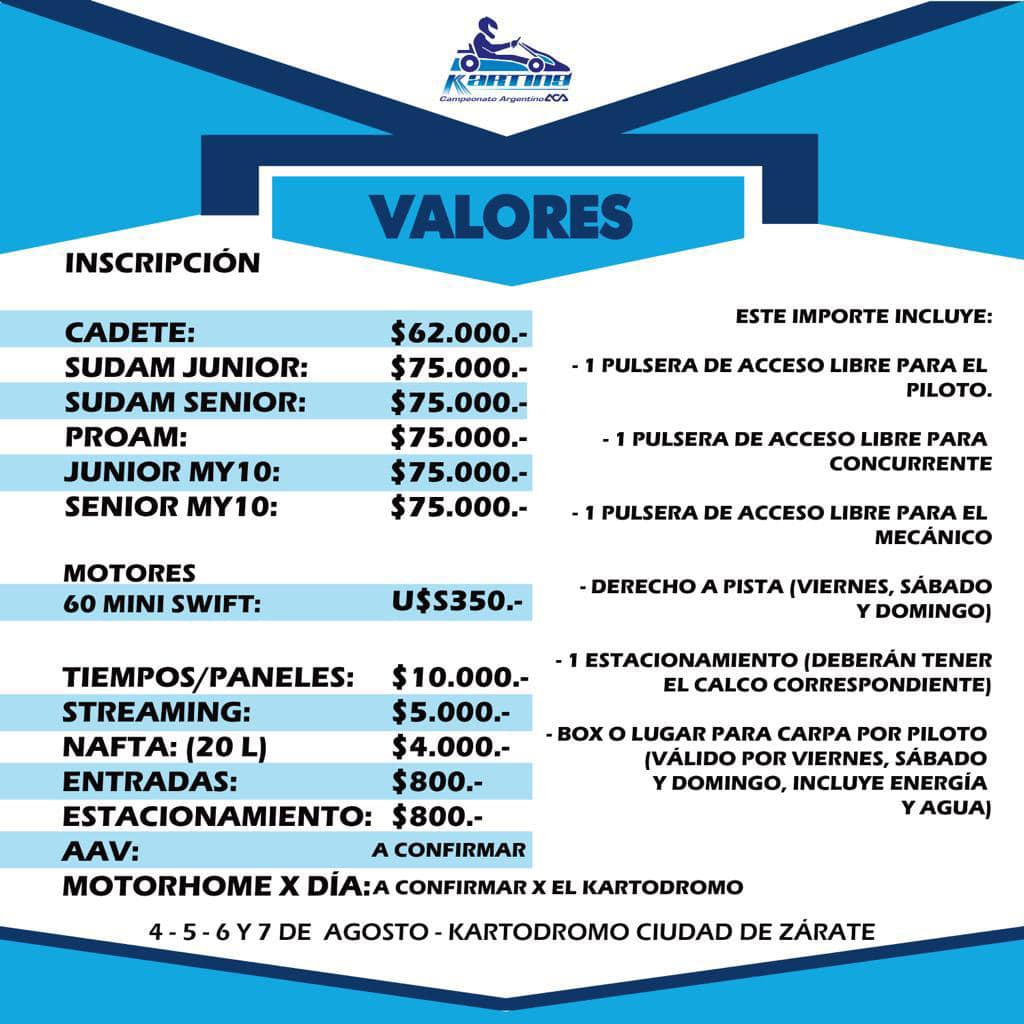 La Comisión Nacional de Karting dio a conocer los valores de inscripción y demás para la carrera especial que el Campeonato Argentino de Kart disputará el próximo mes en Zárate (Buenos Aires).
