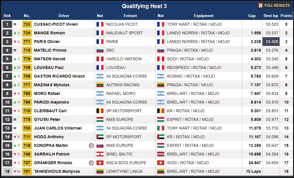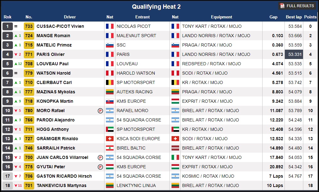 Por segundo día consecutivo, el mejor posicionado fue Rafa Moro que partirá 7° y es una de las esperanzas argentina para el podio, mientras que se destacó el trabajo de Alejandro Parodi, que ayer avanzó 7 lugares en el heat y hoy nuevamente recuperó posiciones en los dos disputados. Largará 9°. Papu Hirsch saldrá 10° con ganas de continuar avanzando, mientras que el cordobés Juan Villarroel ocupará el 16° lugar de la grilla pre final, en su primera incursión en el karting europeo.