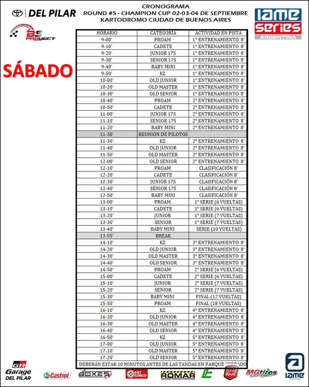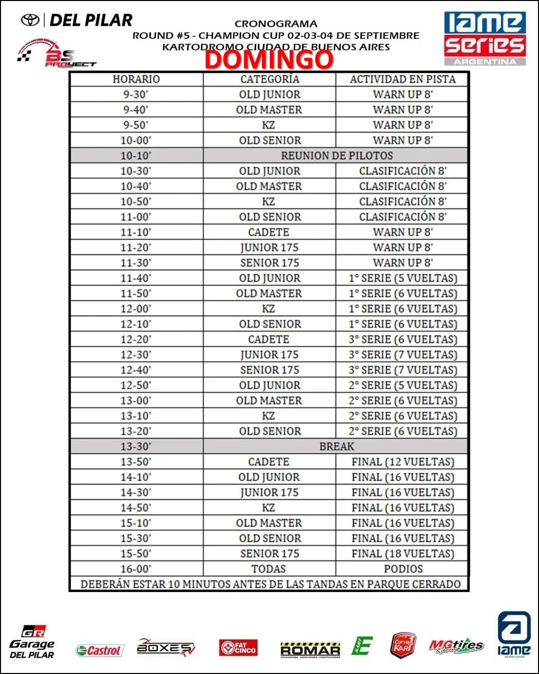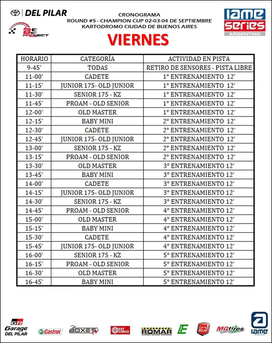 El escenario para este finde es el circuito 1 en sentido anti horario del Kartódromo Internacional de Buenos Aires, donde se presentarán las clases Baby y Proam que tendrá su actividad completa el sábado, mientras que Old School Junior, Senior y Master, más los KZ lo harán el domingo. Tendrán jornada doble Cadete, Junior 175cc y Senior 175cc.