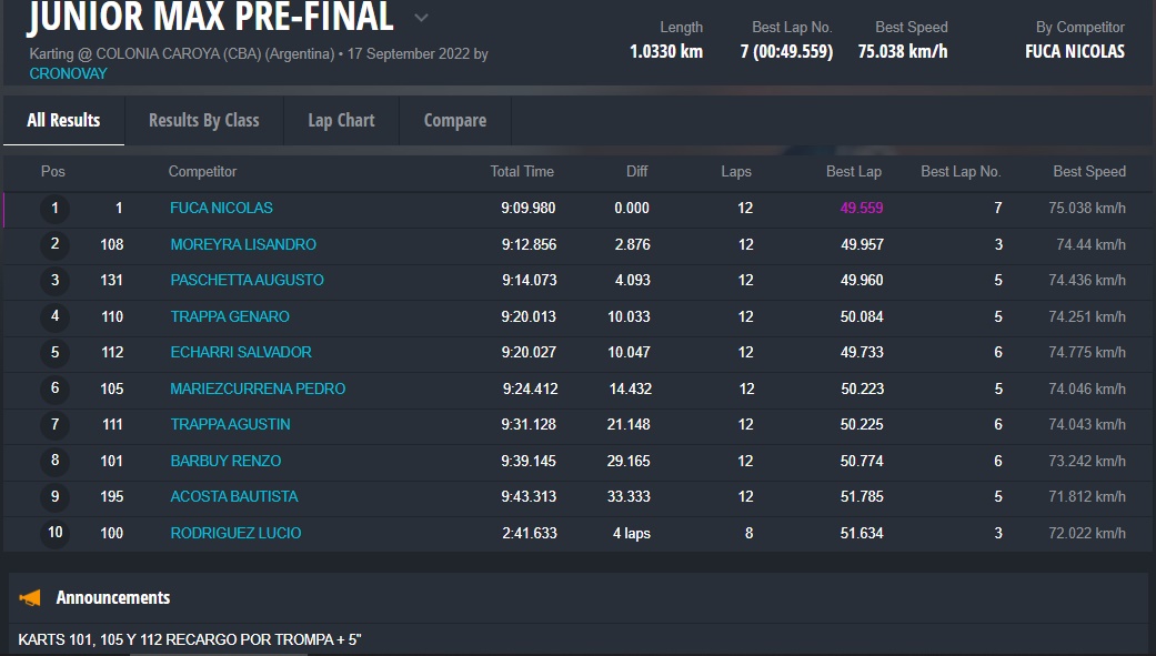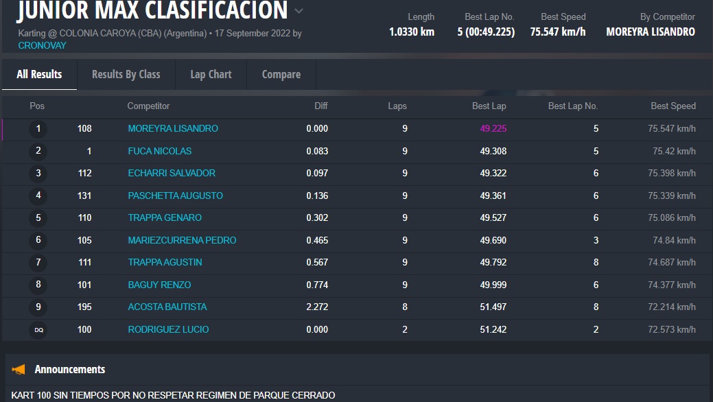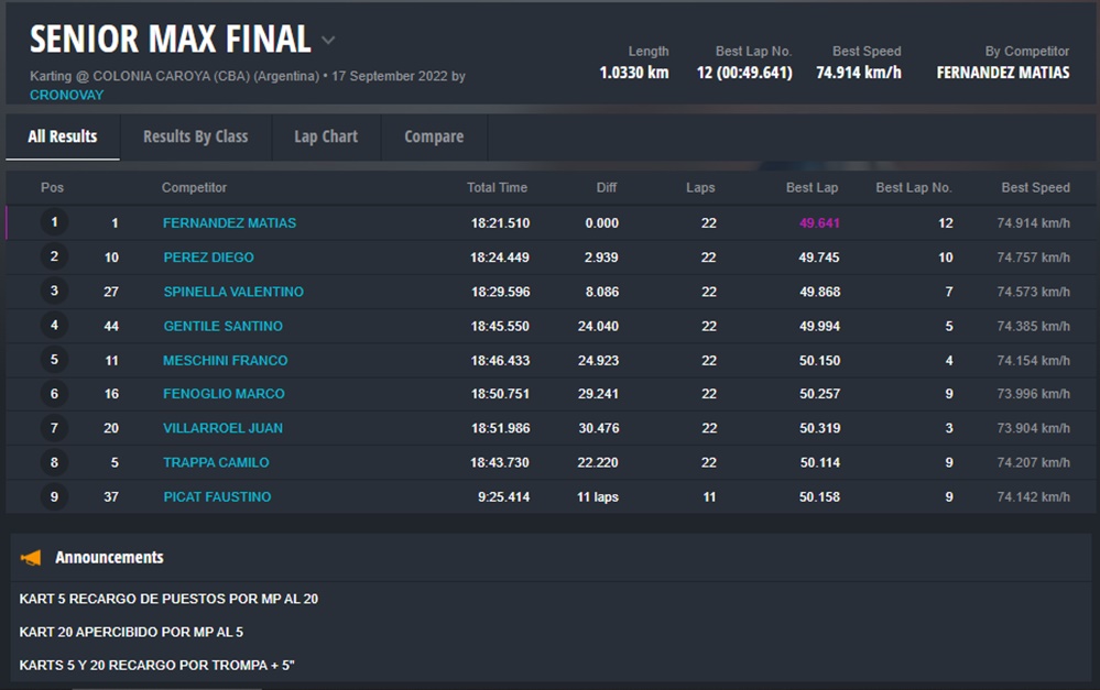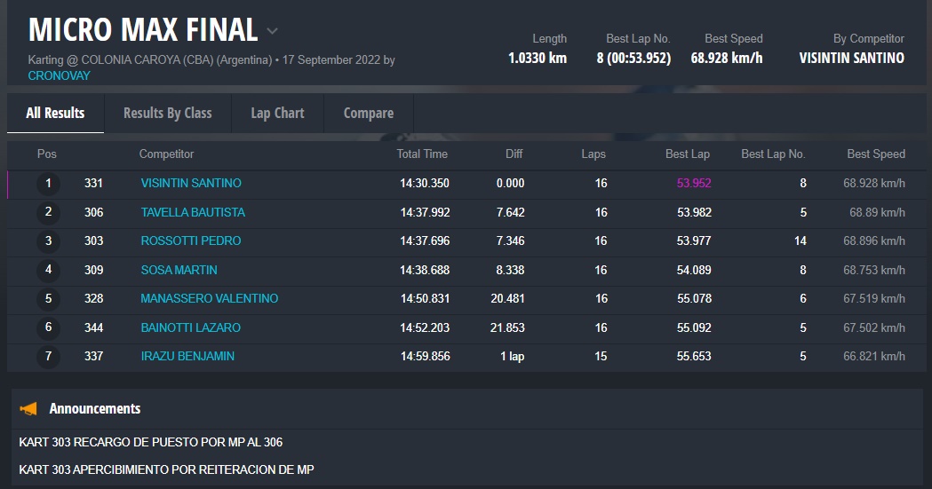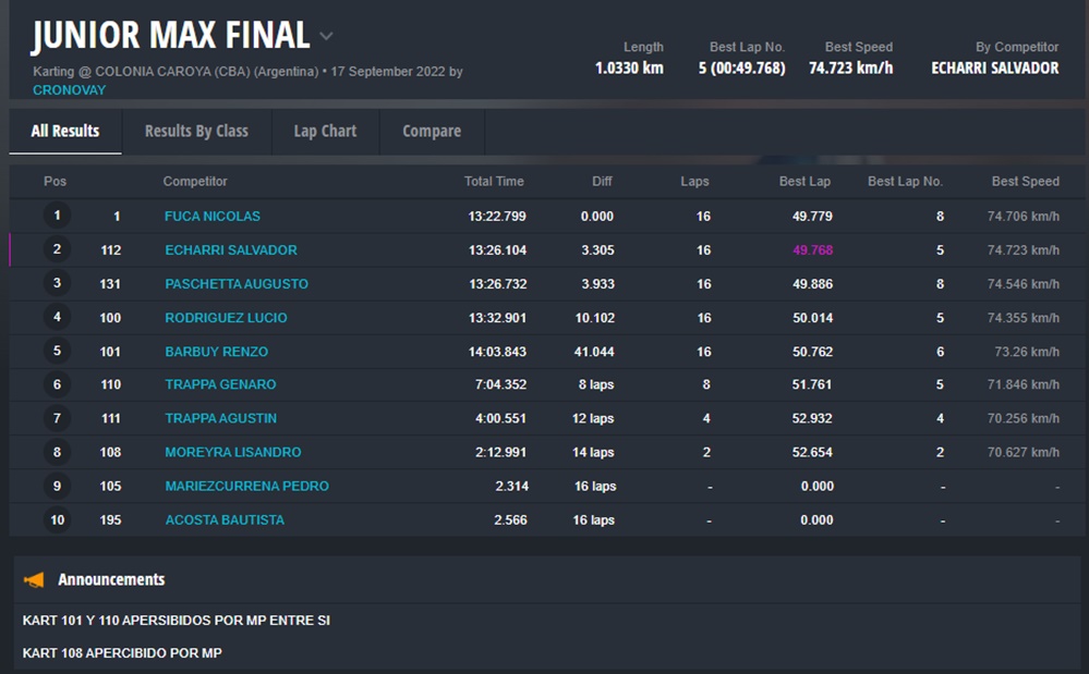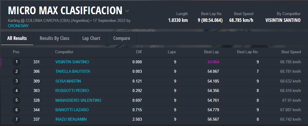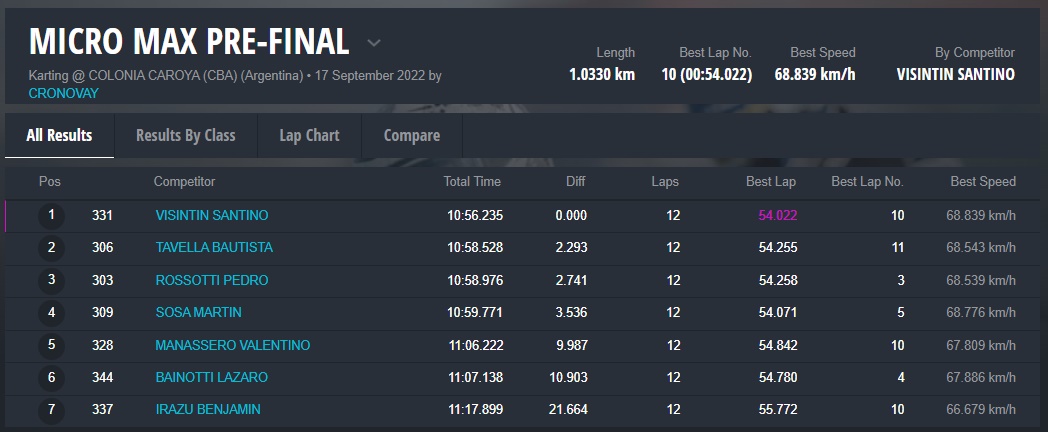 Mañana domingo será el turno de la fecha coronación para las categorías Micro, Junior y Senior, recordando que Matías Bonvín se había coronado el evento pasado en Sunchales en Master Max, clase que en esta fecha no tuvo participantes.