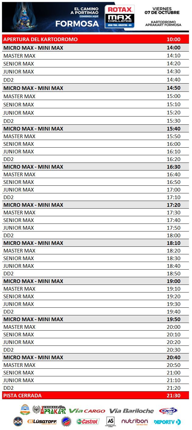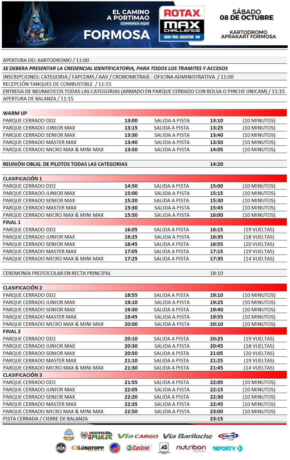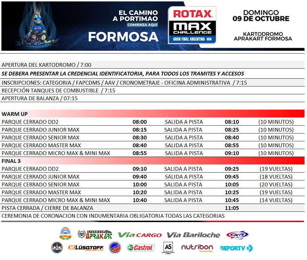 Con bastante antelación, Rotax Argentina dio a conocer el cronograma oficial para la “Gran Final Argentina” que se disputará el 7, 8 y 9 de octubre en Formosa.