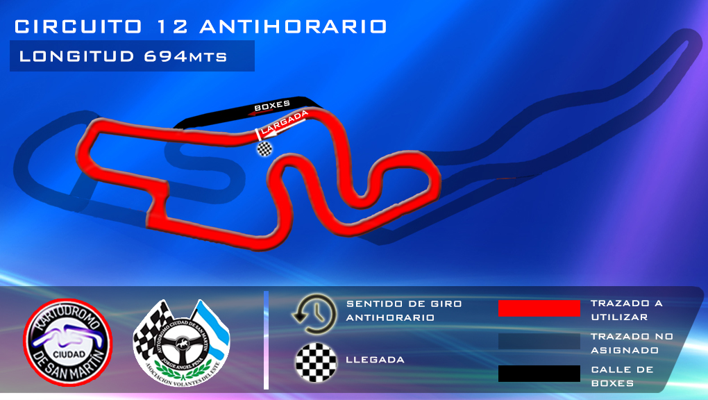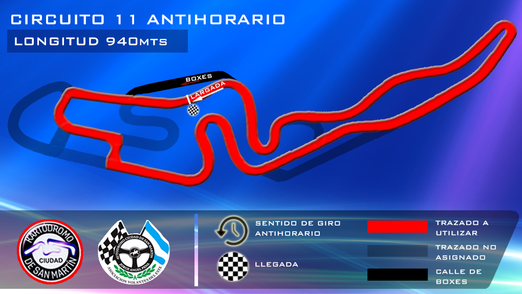 Para la ocasión se usará el circuito 11 sentido “anti horario”, totalmente nuevo, ya que no tenemos referencia de que se haya usado en los últimos 3 años. La categoría infantil usará el 12 anti horario.
