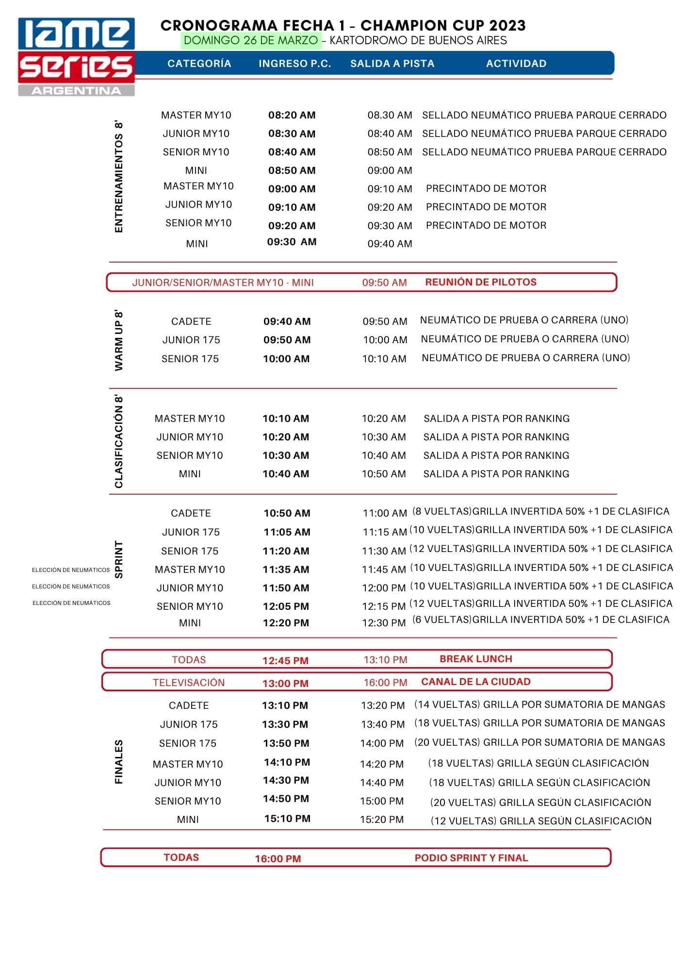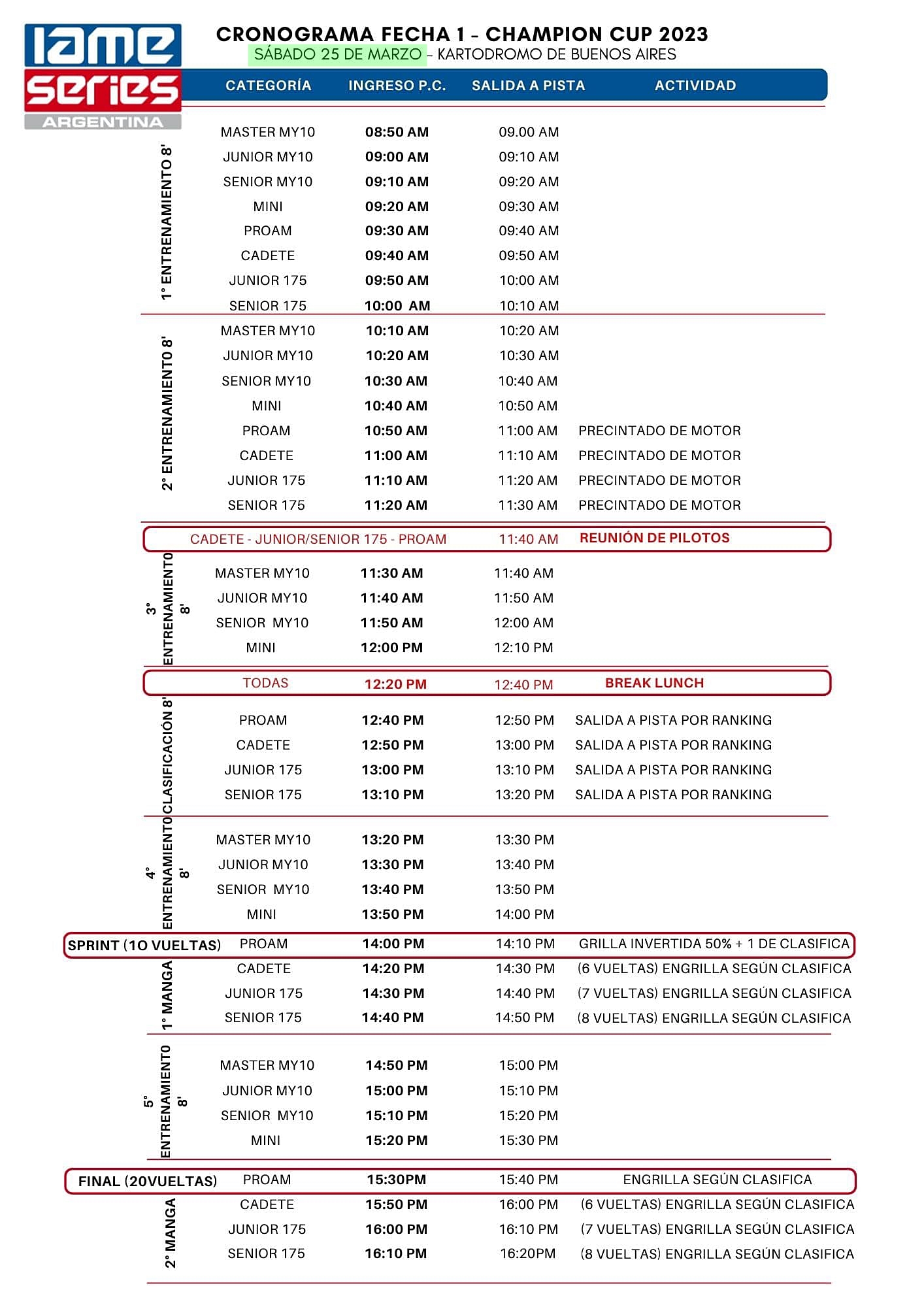 Se espera más de un centenar de pilotos de todo el país, para que animen todas las categorías 2 tiempos motorizadas por IAME como son la Escuela, Cadete, Junior 175cc, Senior 175cc, Proam y las que usan motores 125cc como son Old School Junior, Senior y Master.