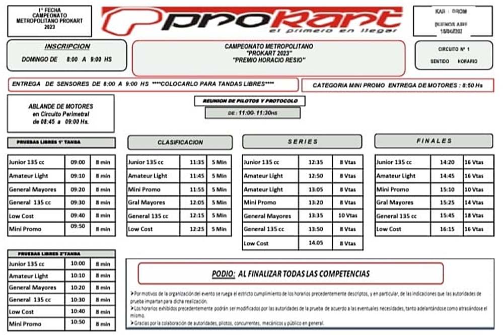 Horarios y datos para la carrera apertura de Prokart en BA