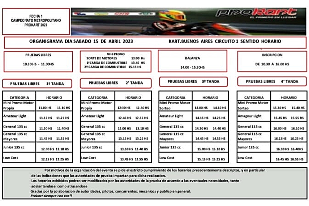La programación no cambia, es clásica: sábado de prácticas y domingo de competencias, donde saldrán al asfalto del Kartódromo de Buenos Aires en este orden: Junior 135cc, Amateur Light, Mini Promo, General Mayores, General 135cc y Low Cost.