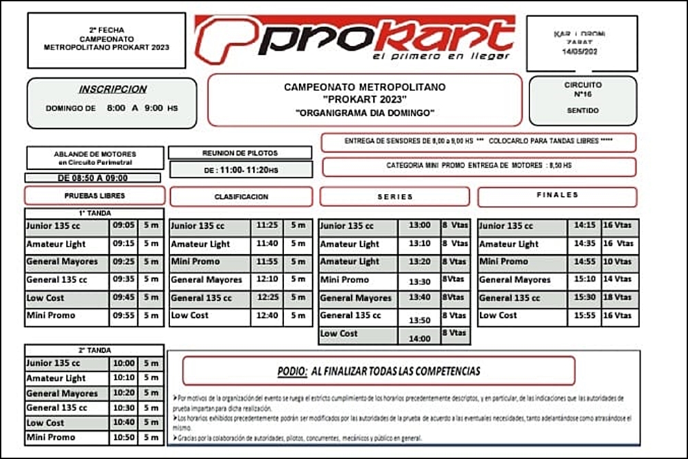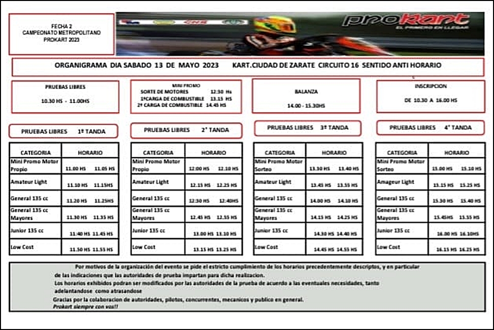Se esperan más de setenta pilotos de distintas localidades, para integrar este segundo capítulo de Prokart donde el día sábado se realizarán 4 tandas de prácticas como previa de toda la actividad oficial del domingo.