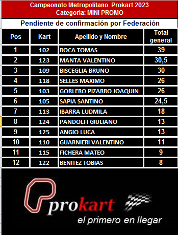 “Toto” Roca del equipo DRK Racing lidera la clase MINI PROMO con 8,5 puntos de diferencia respecto a Valentino Manta, el ganador de la última fecha y que sumó su primera victoria en Prokart.