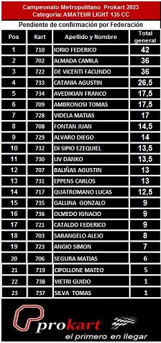 Con 23 pilotos rankeados, la clase AMATEUR LIGHT 135cc es la más numerosa del certamen. Lidera quien ganó el domingo pasado Federido Iorio con una ventaja de 5 unidades sobre la subcampeón 2022 Camila Almada, que festejó en la fecha inicial.