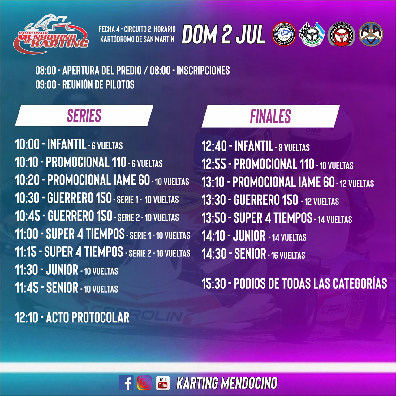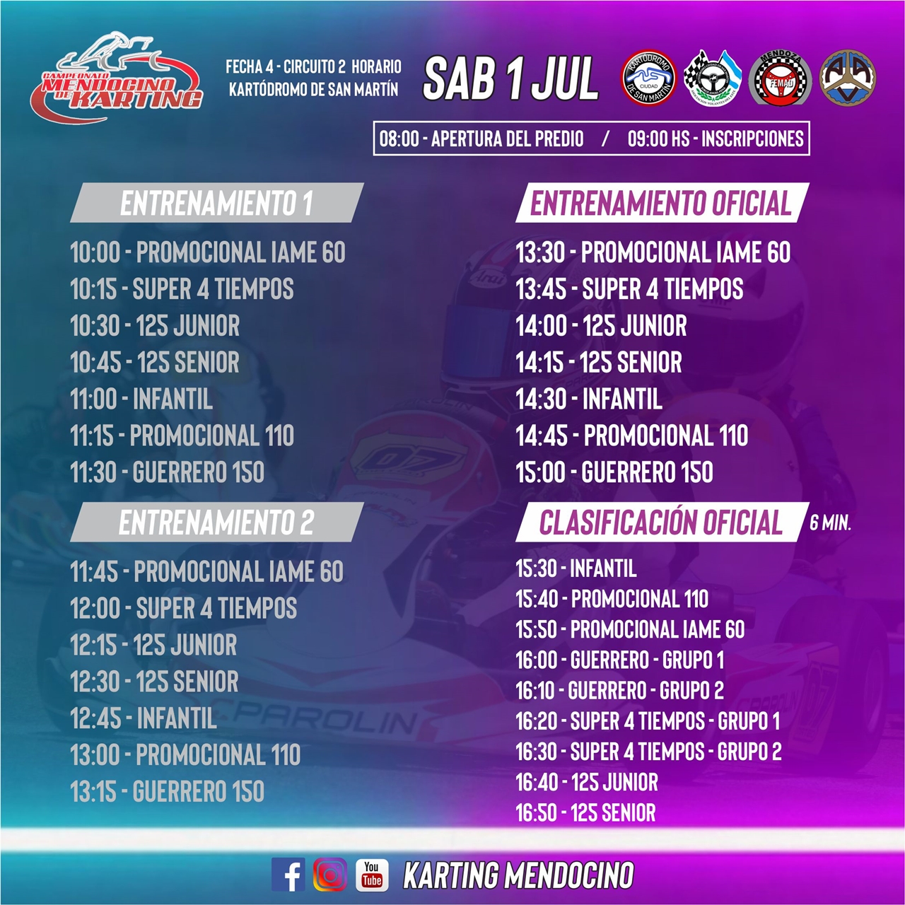 La organización informó que el Kartódromo de San Martín estará abierto para pruebas libres el próximo miércoles 28 y viernes 30 de junio de 14 a 18 horas. Reservar turnos al WhatsApp 2634287970 (José Bravo).