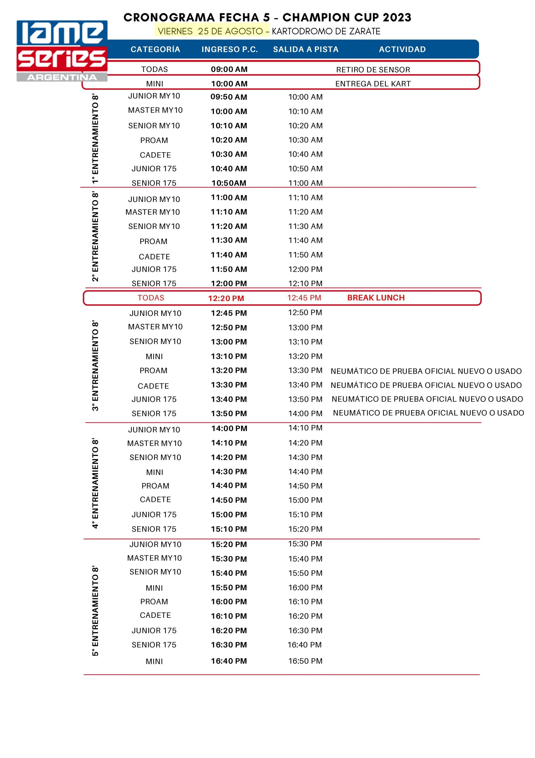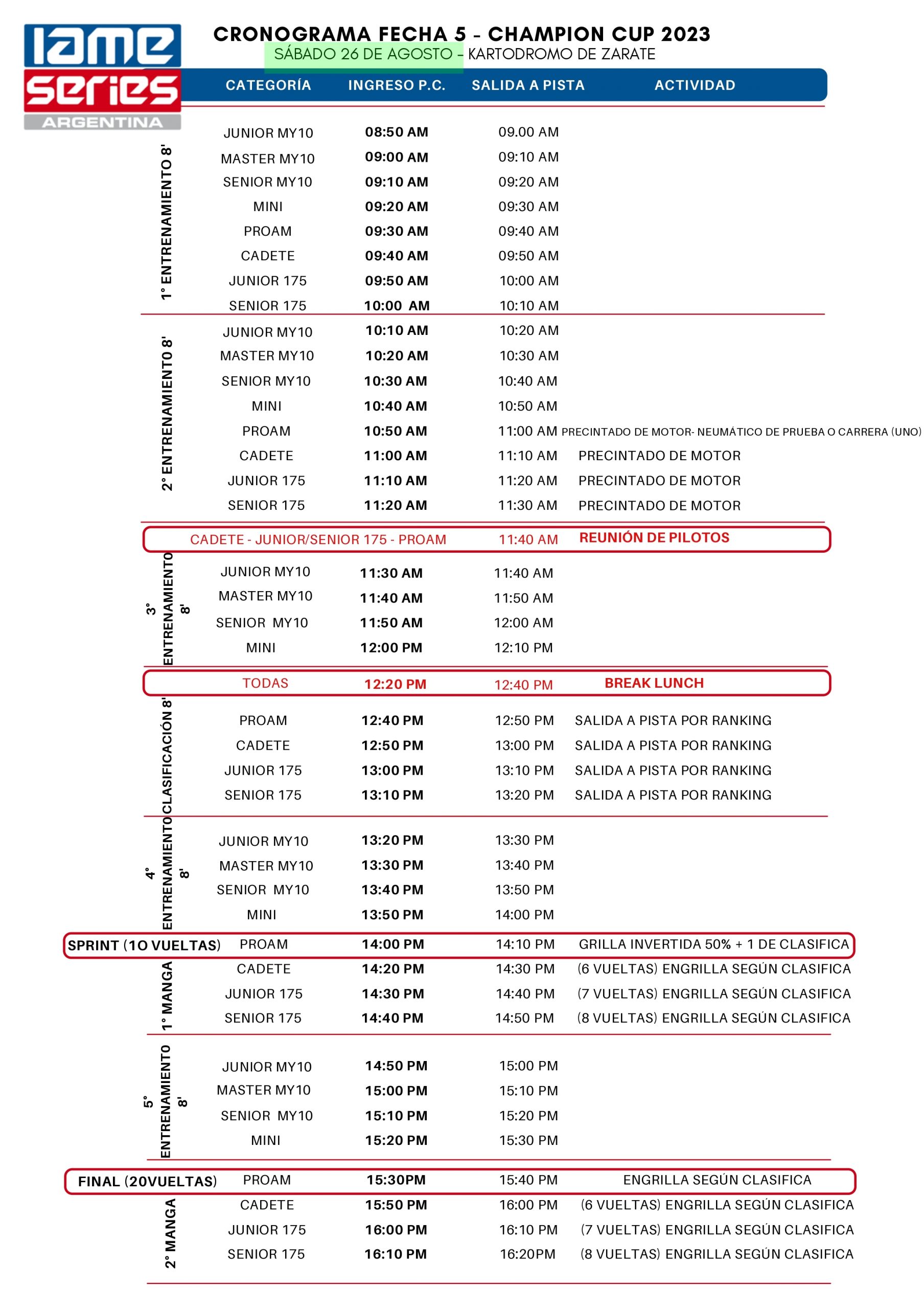 La cita es en el Kartódromo Internacional de Zárate, que recibe a IAME por segunda vez en la temporada. La anterior fue el 11 de junio, carrera válida por la 4° fecha del Champion Cup.