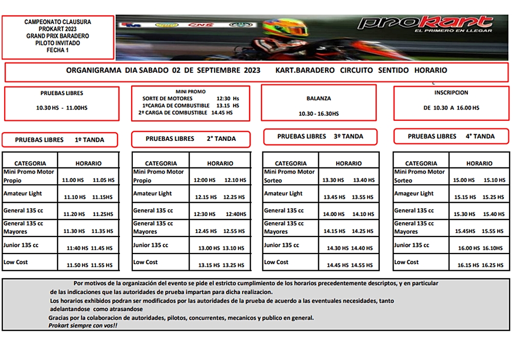 La cita será en el Kartódromo Ramiro Tot de Baradero, donde el sábado habrá 4 tandas libres de entrenamientos y el domingo actividad oficial con 2 prácticas, clasificación y la final a 28 vueltas, donde habrá cambio de pilotos y bujía “en plena carrera”.