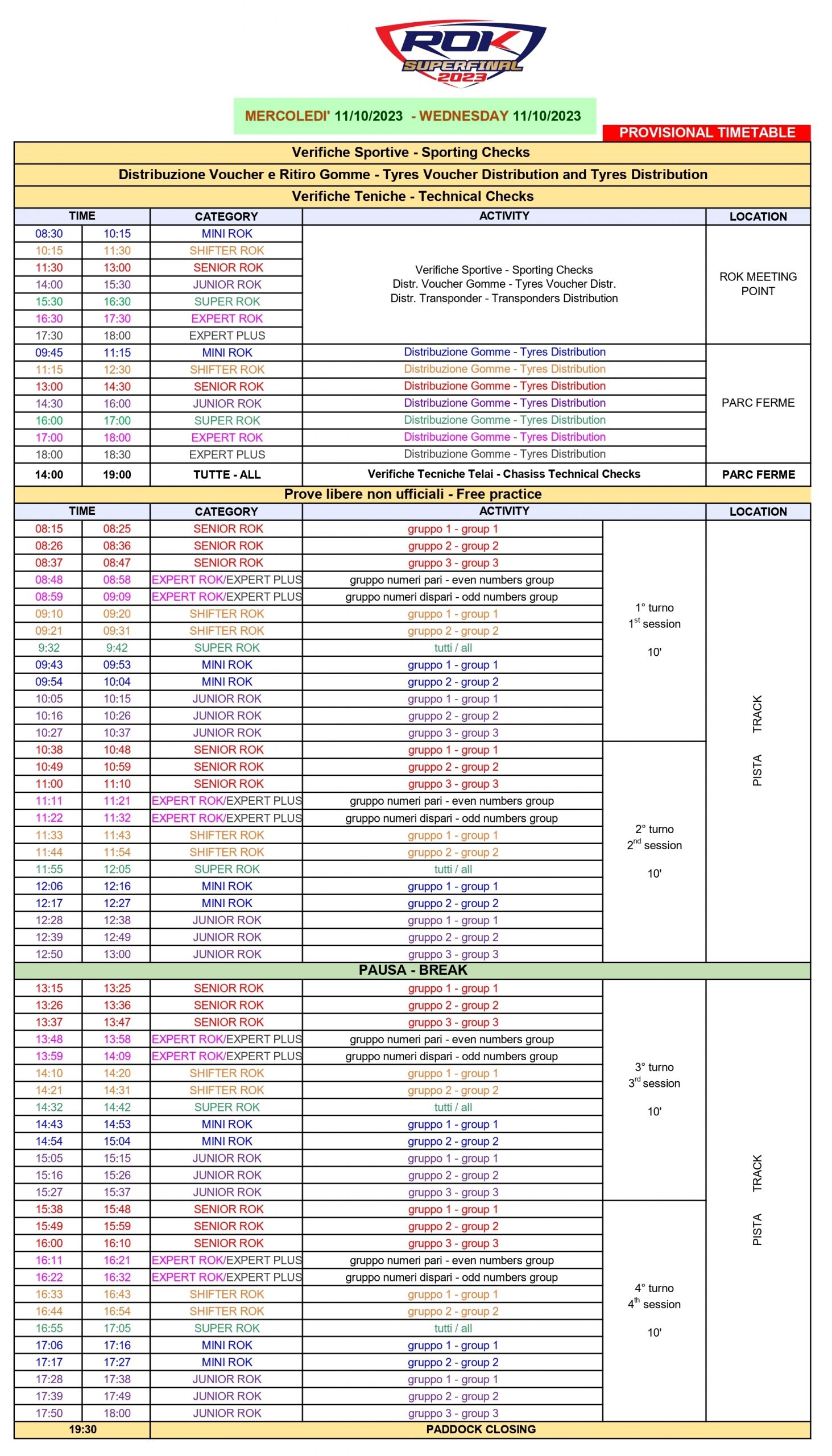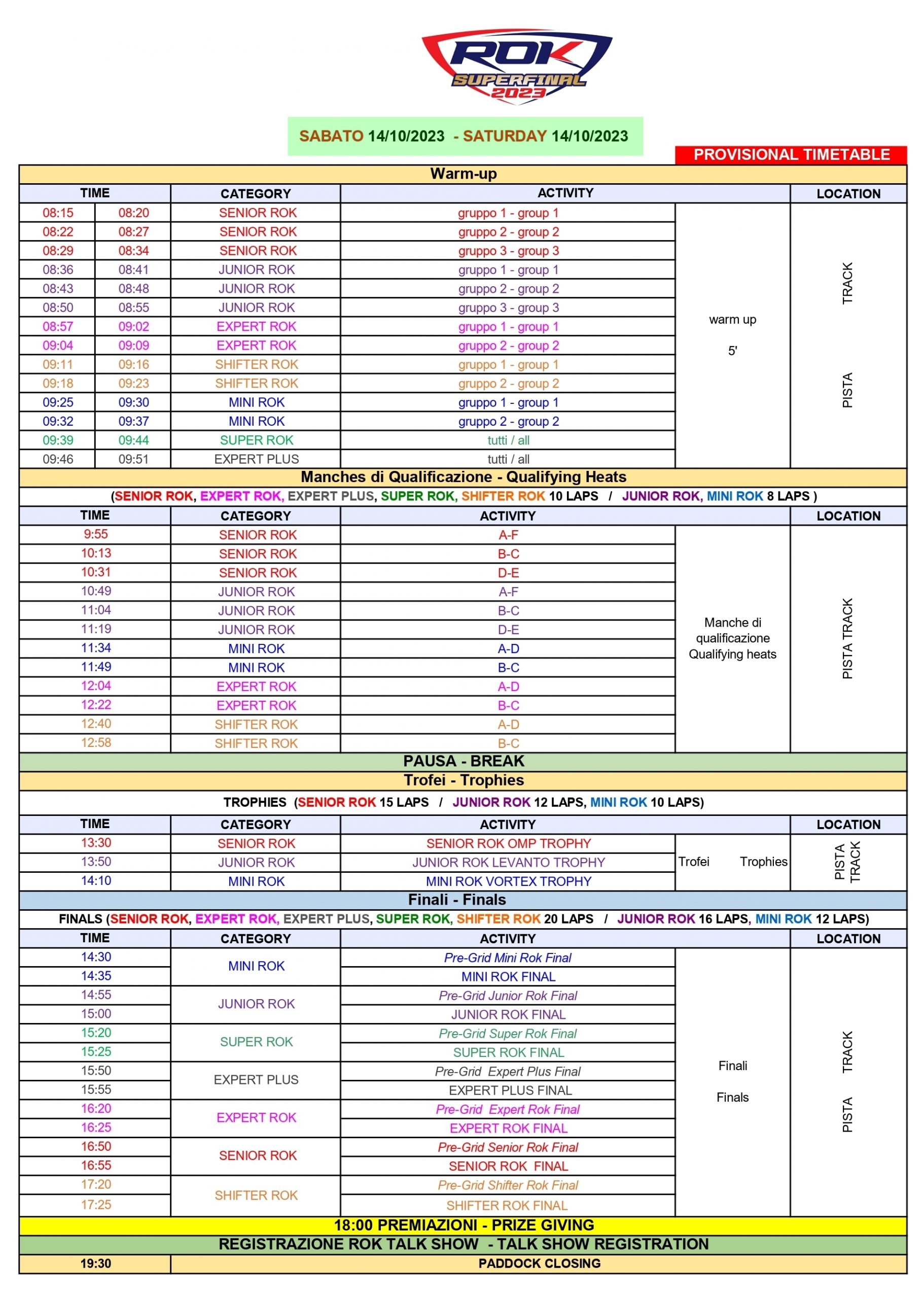 ROK Supefinal comienza en forma “oficial” comienza el MIÉRCOLES con pruebas libres que creemos no serán cronometradas (como pasó el año anterior). El dia JUEVES se llevará a cabo la clasificación y mangas, continuando el VIERNES con más mangas. La jornada de SÁBADO tendrá warm up, las últimas mangas, los “Trofeos” o Finales B y las carrera Finales de cada categoría.