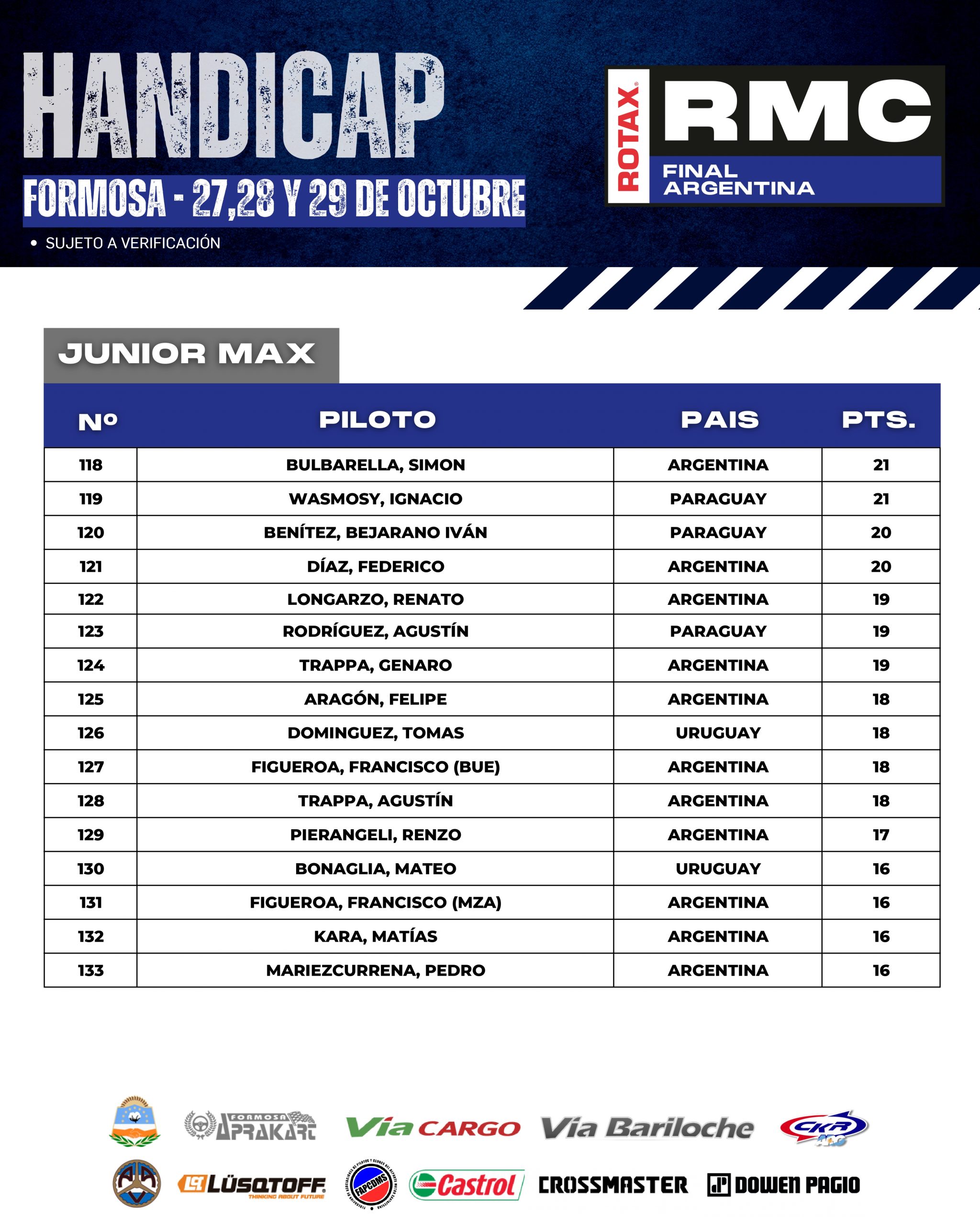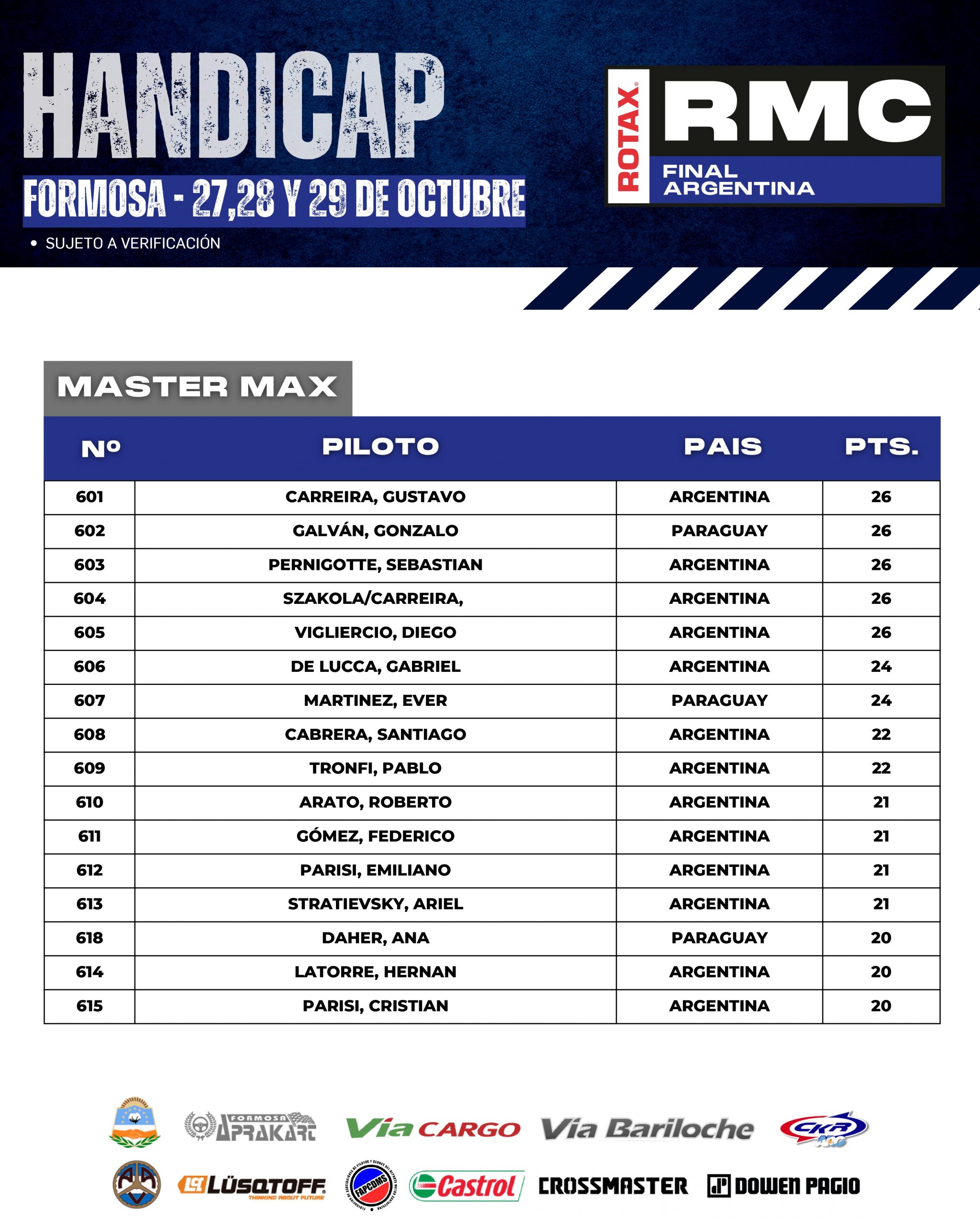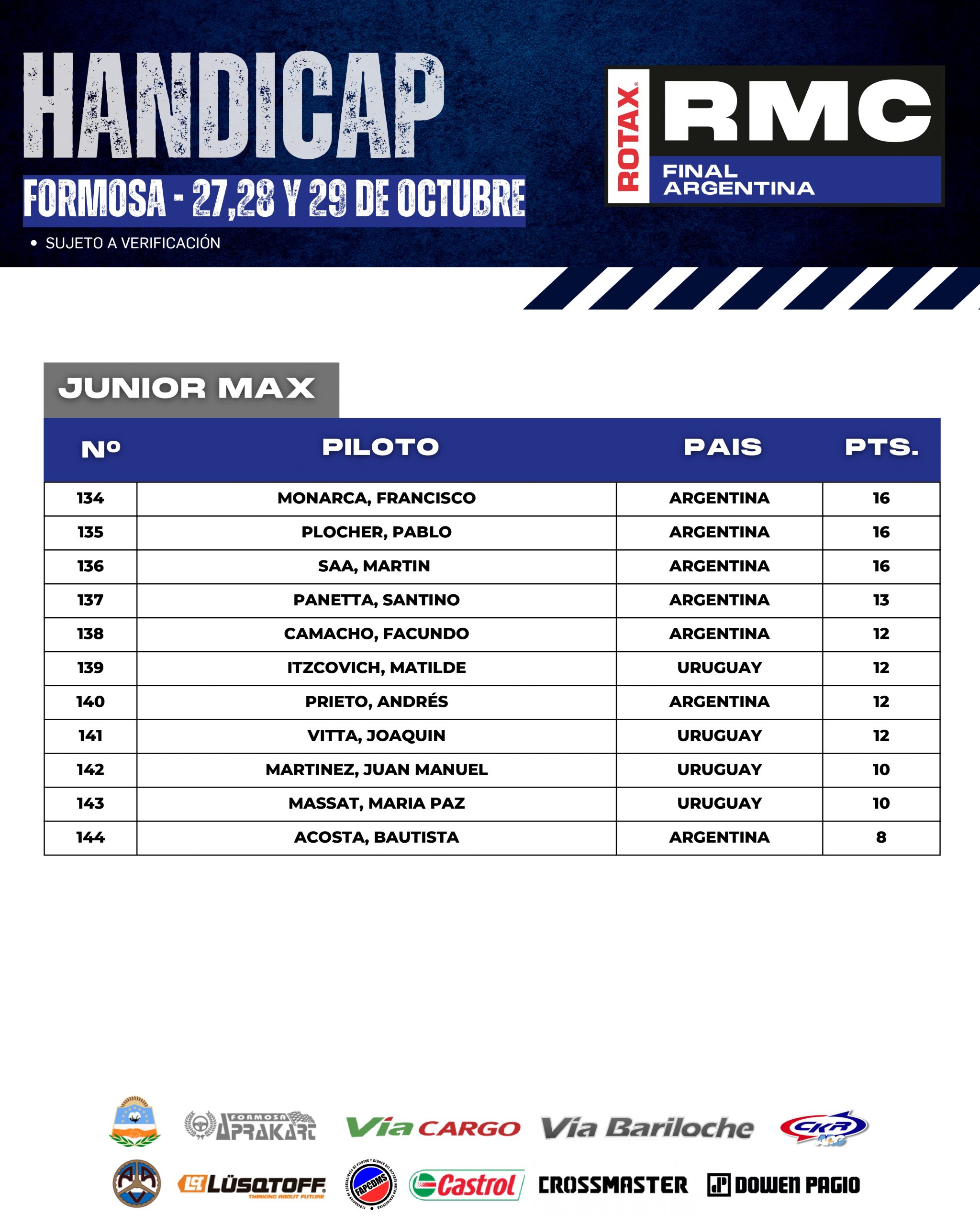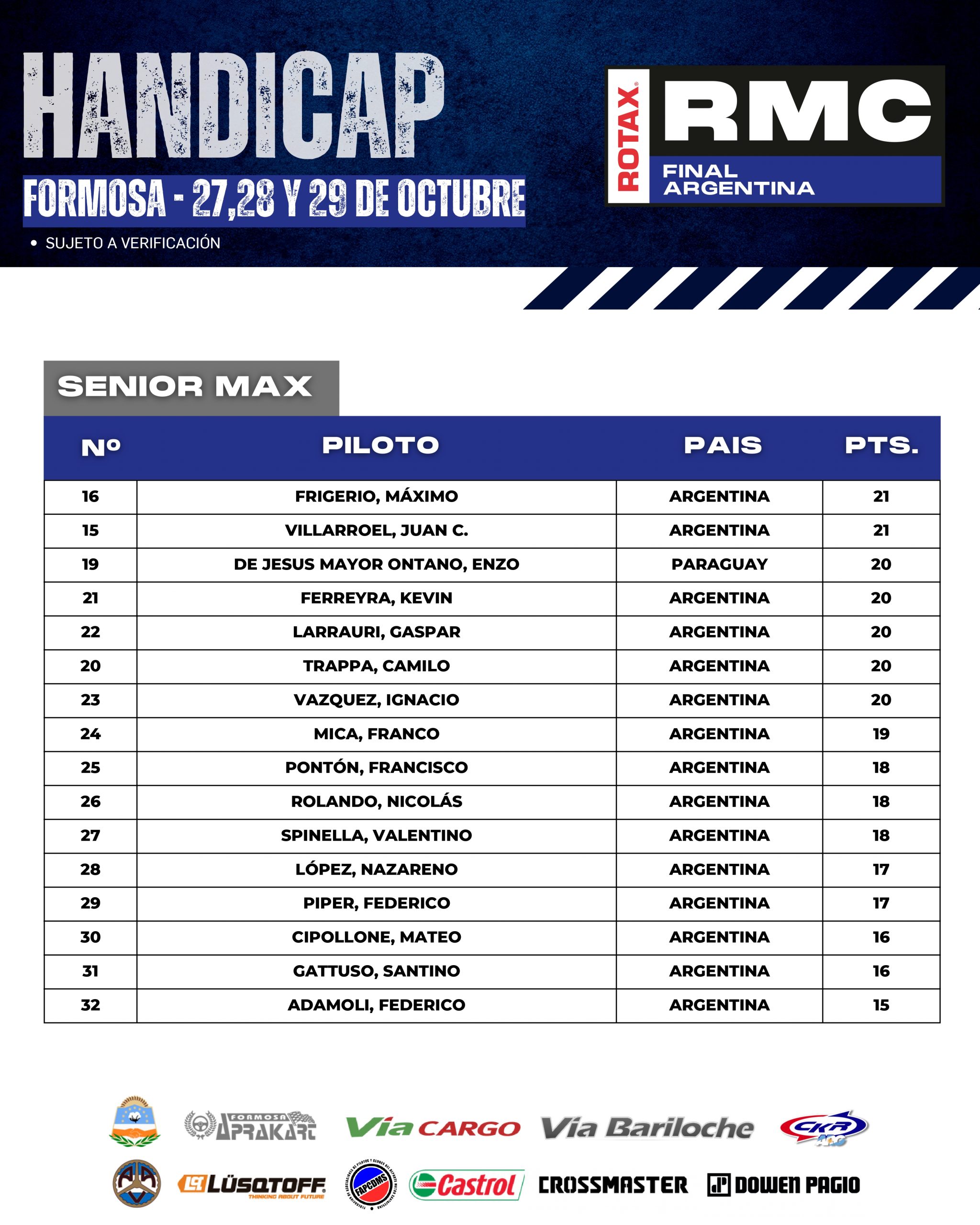 A continuación te mostramos como llegan los HÁNDICAP de cada categoría, esto es, que cada pilotos comenzará la Final Argentina con este puntaje, que se sumará al que obtengan durante el fin de semana y “quien más puntos sume en cada categoría” será el acreedor del ticket.