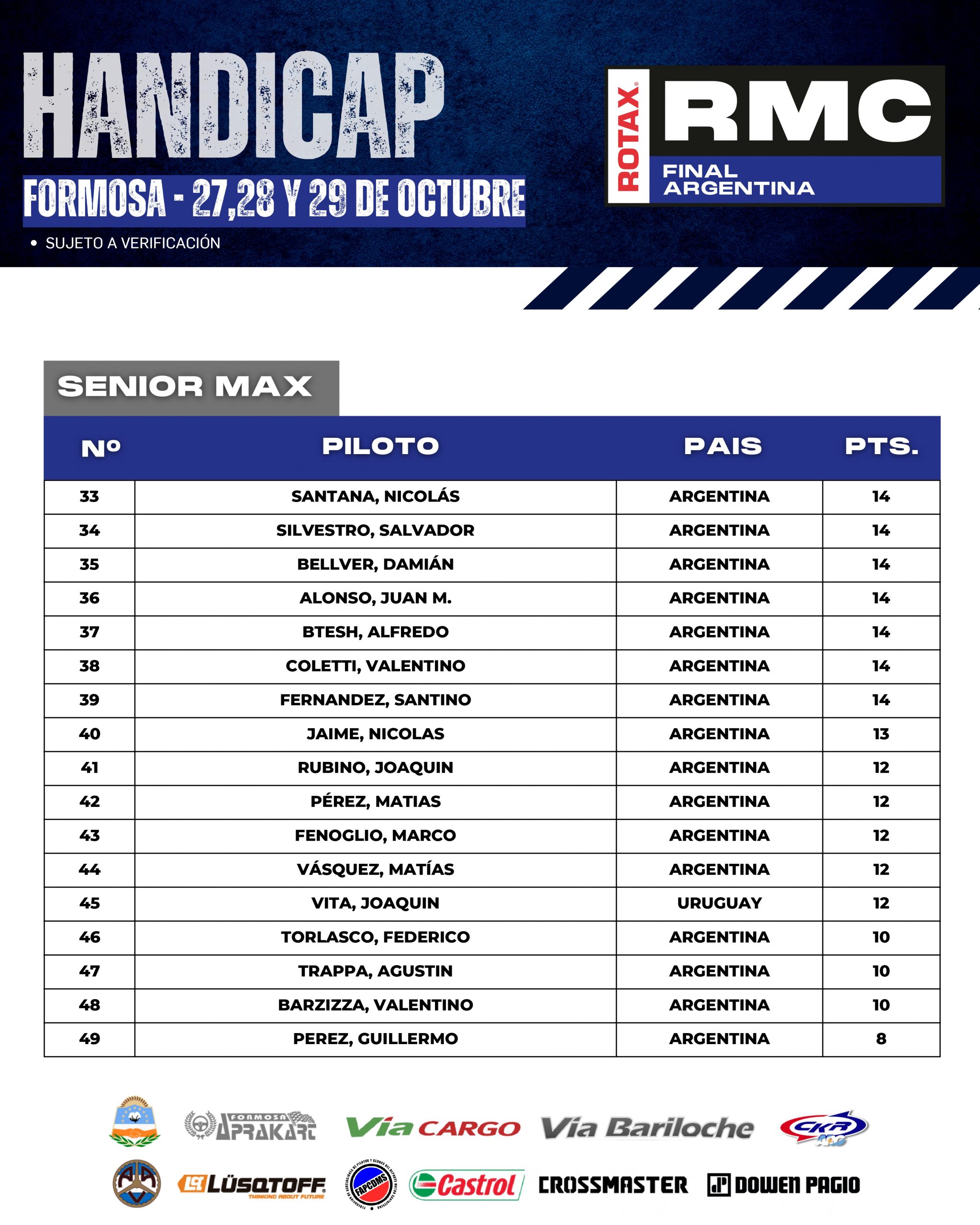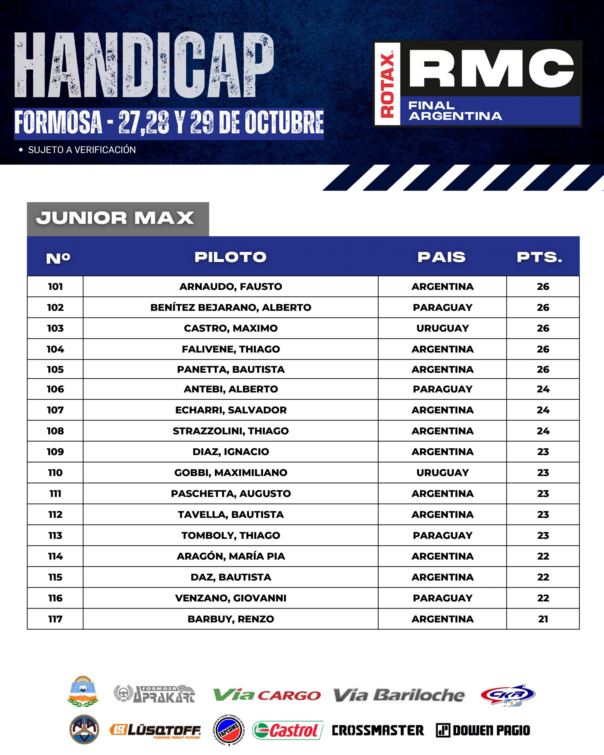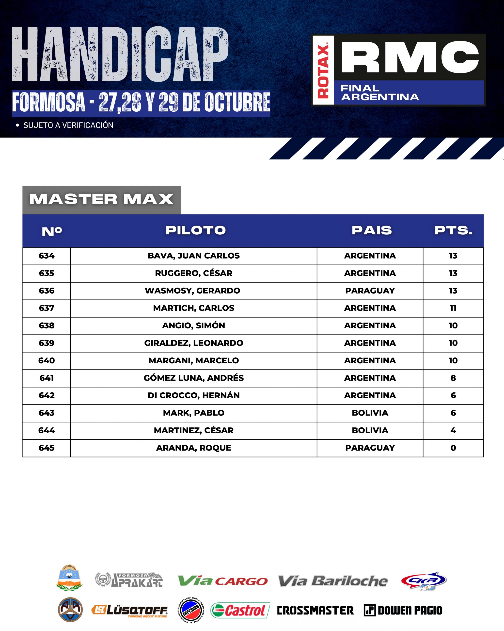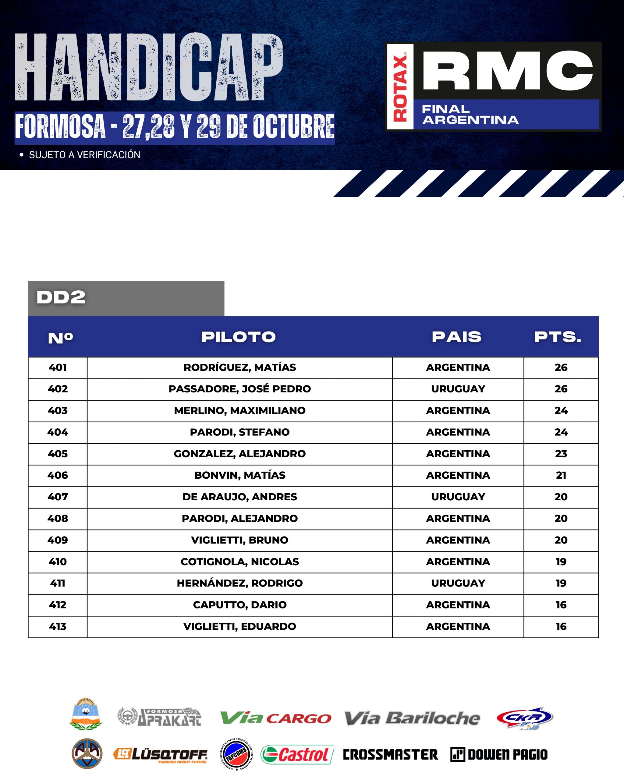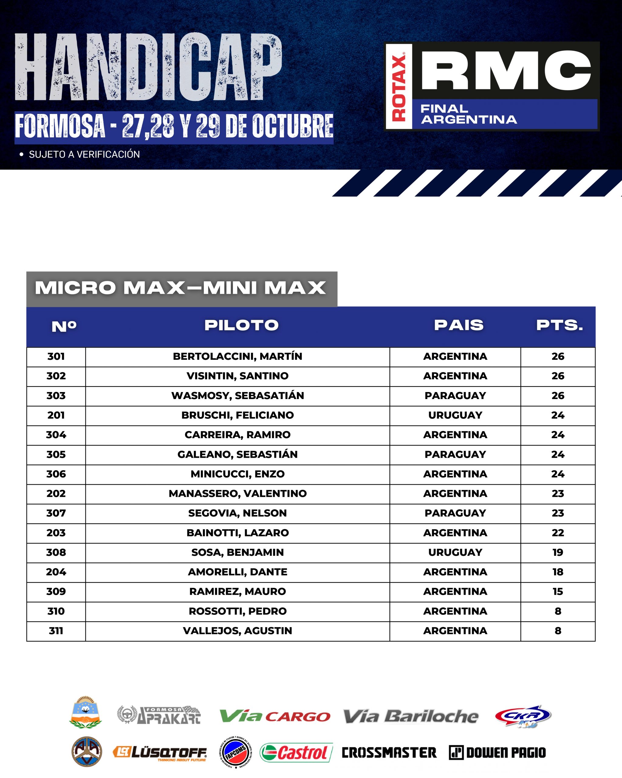 A continuación te mostramos como llegan los HÁNDICAP de cada categoría, esto es, que cada pilotos comenzará la Final Argentina con este puntaje, que se sumará al que obtengan durante el fin de semana y “quien más puntos sume en cada categoría” será el acreedor del ticket.
