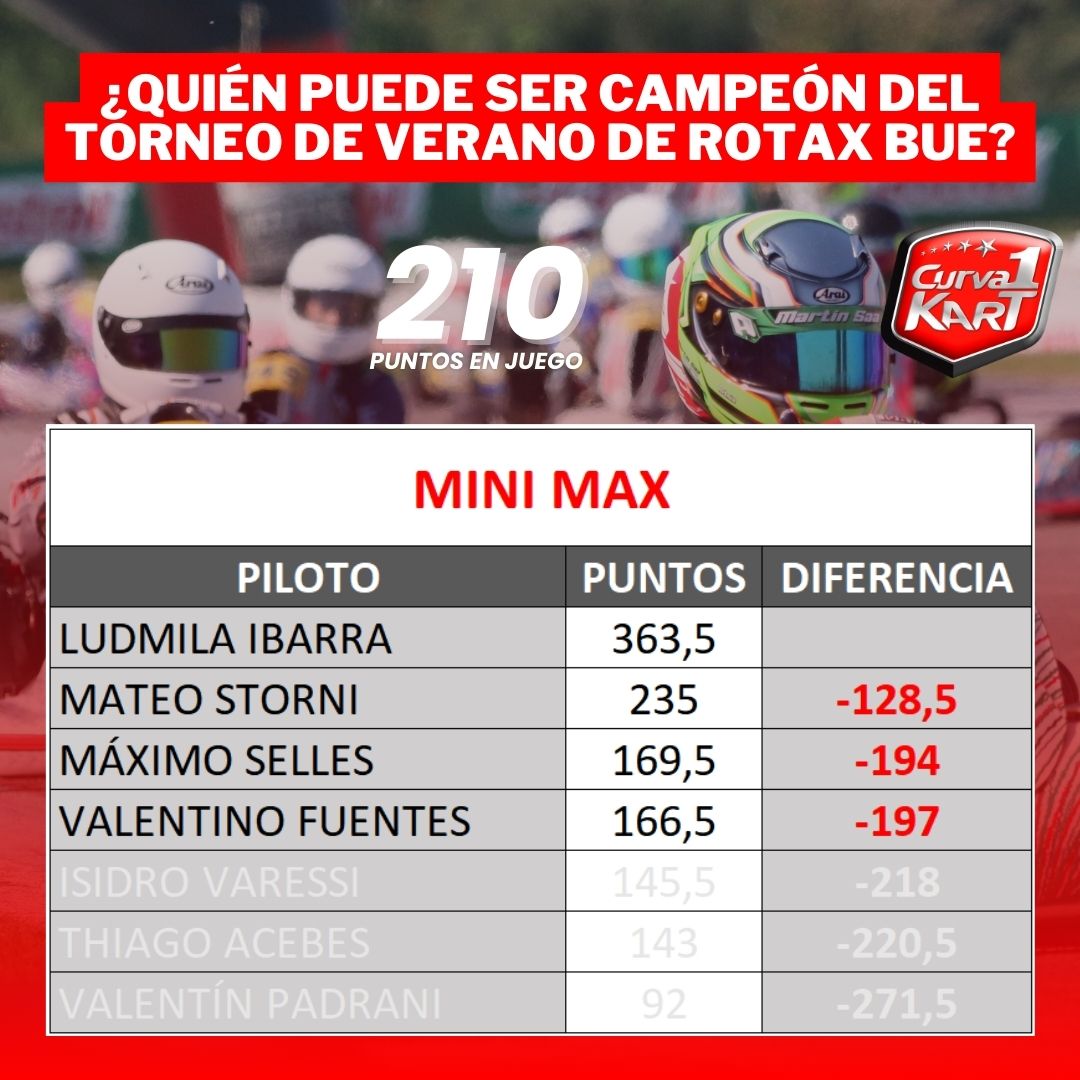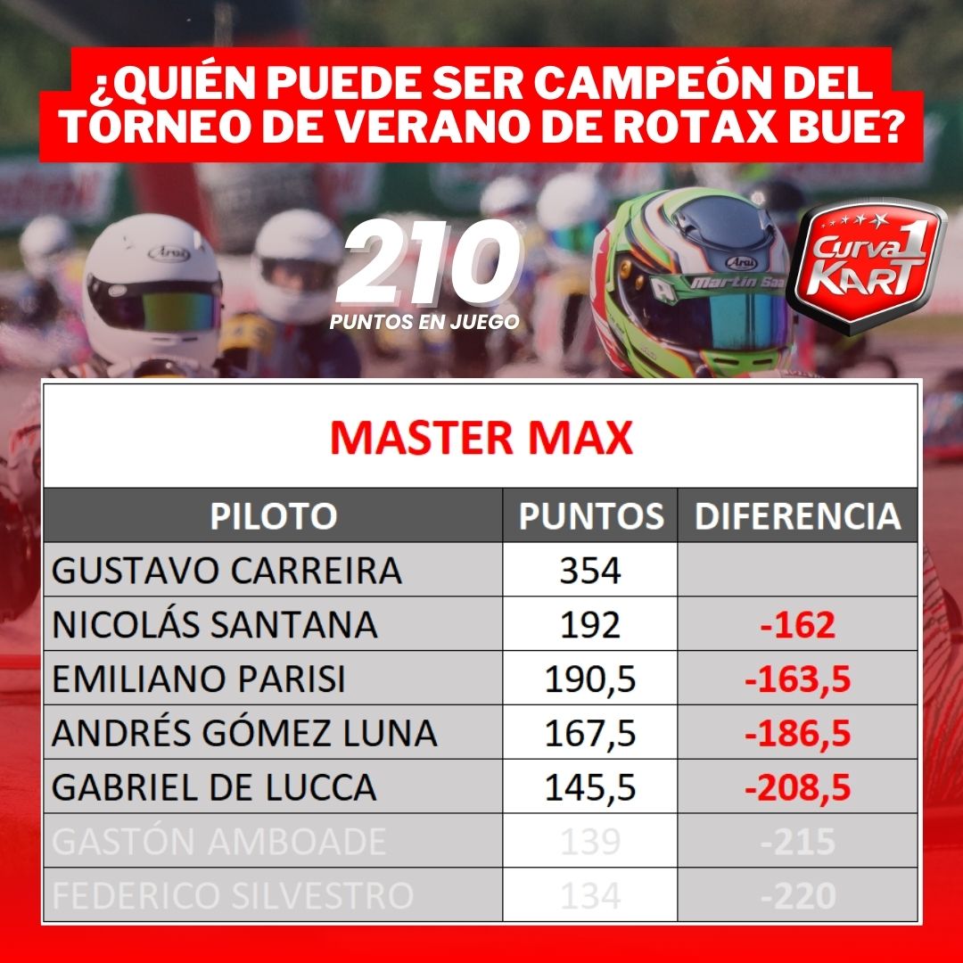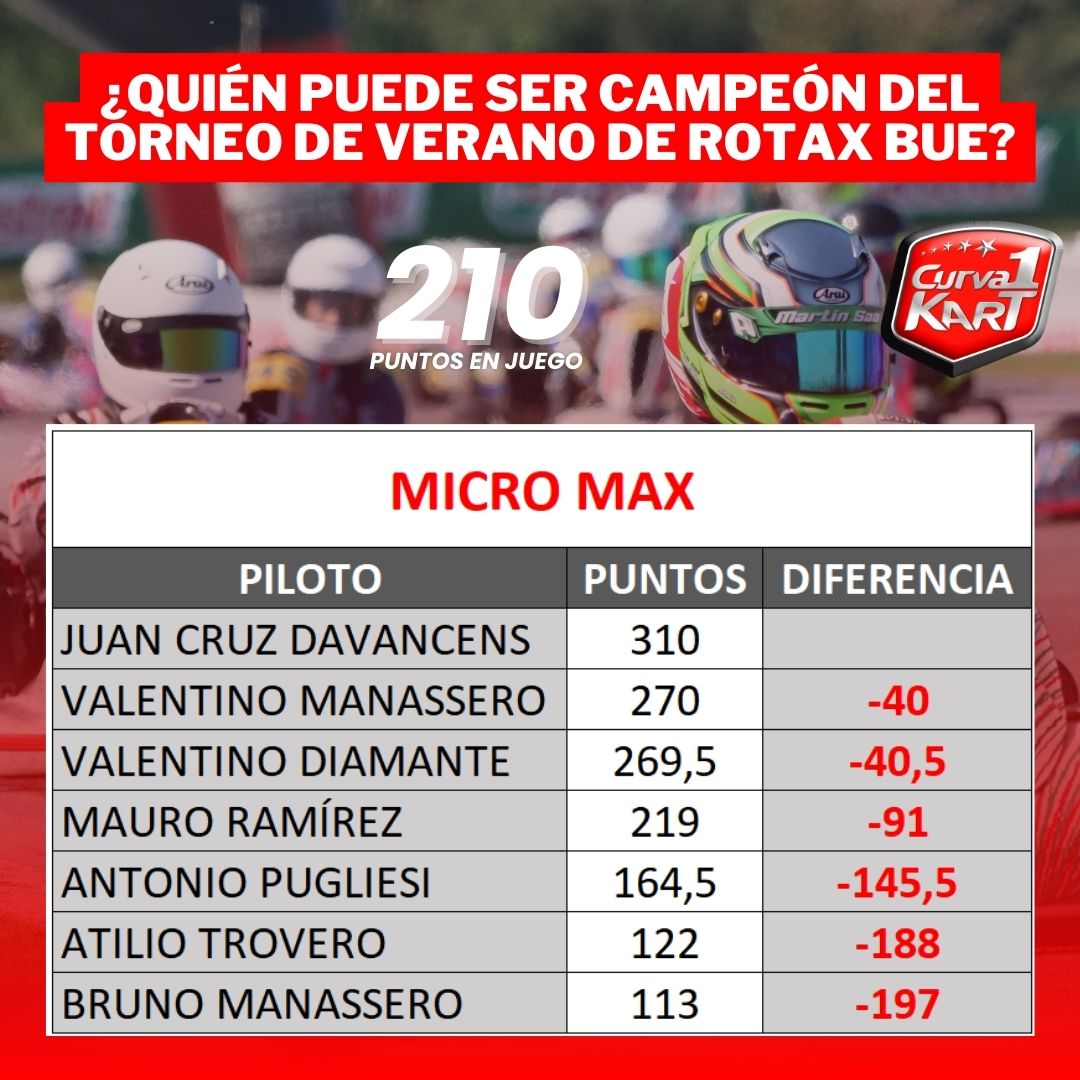 - 210 PUNTOS – Micro, Mini, Junior, Senior, Master y DD2 (2 presentismo, 5 pole, 1 récord de vuelta, 22, 5 cada manga y 52 final).