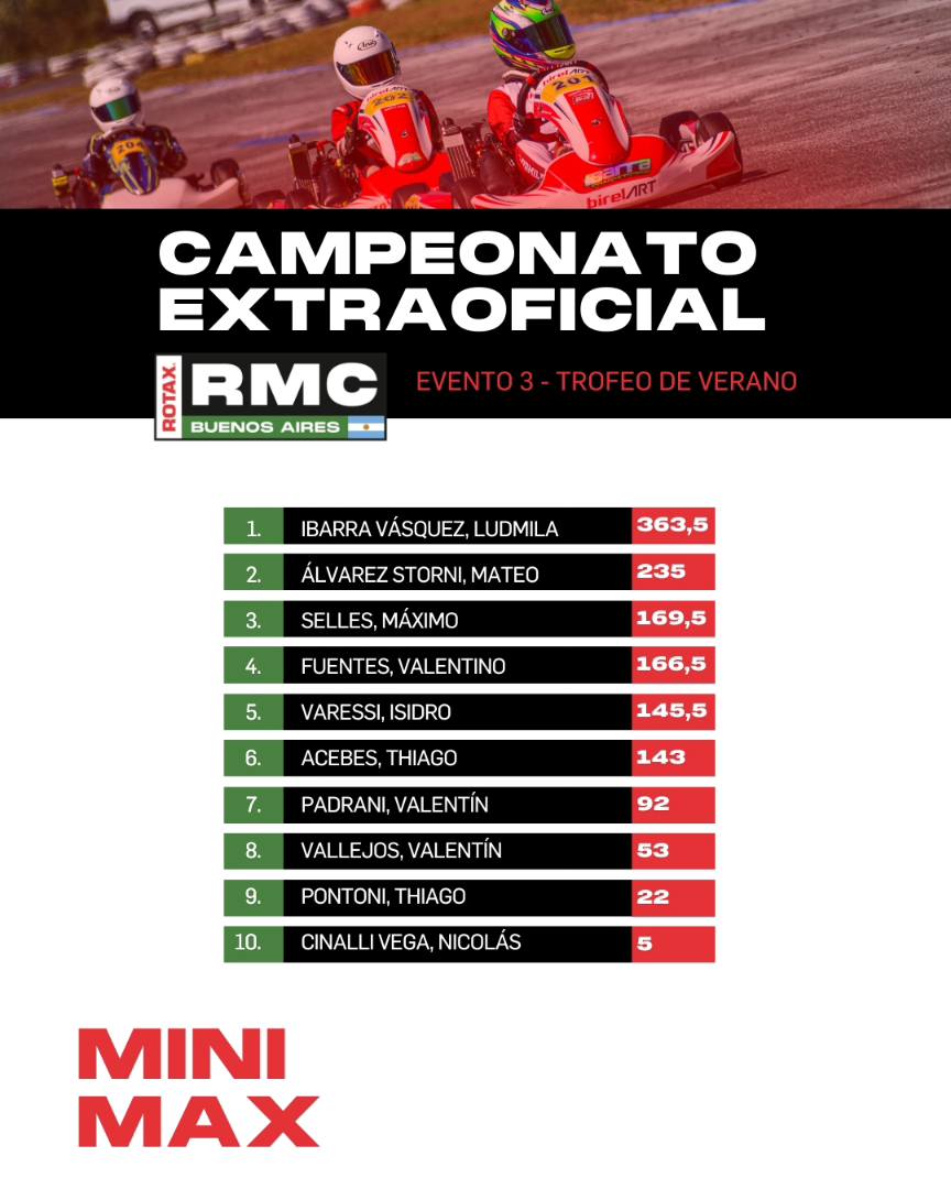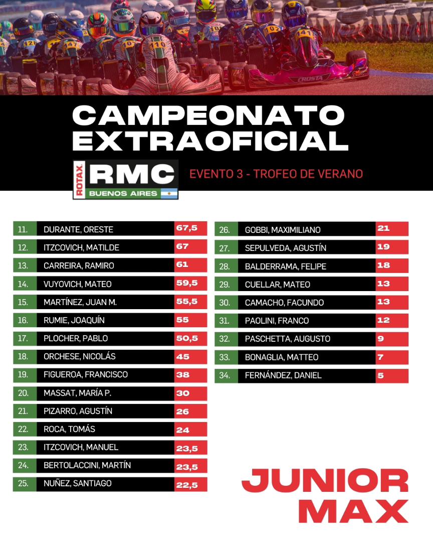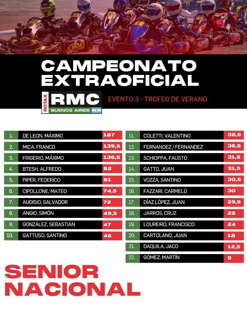 - 210 PUNTOS – Micro, Mini, Junior, Senior, Master y DD2 (2 presentismo, 5 pole, 1 récord de vuelta, 22, 5 cada manga y 52 final).