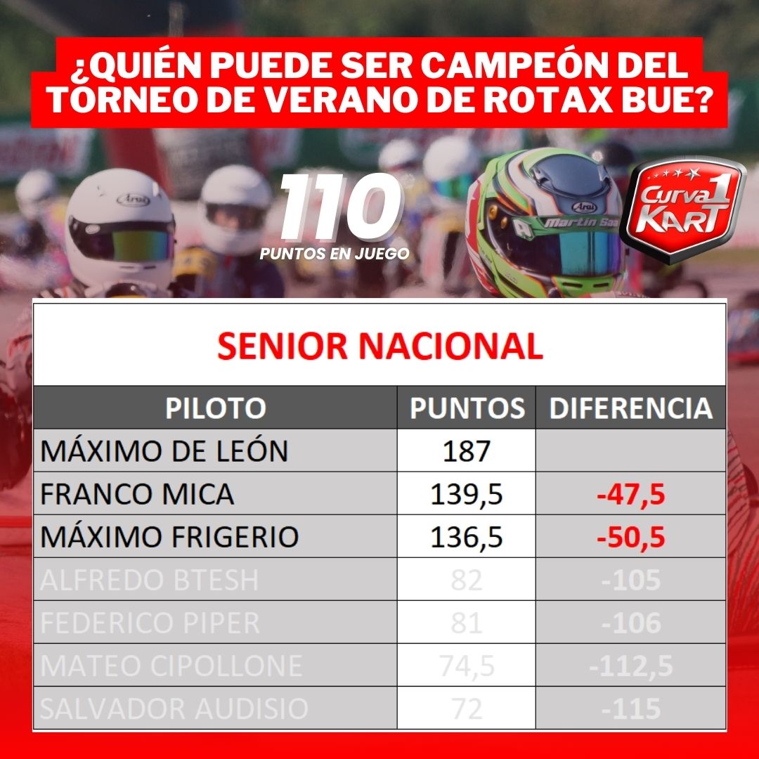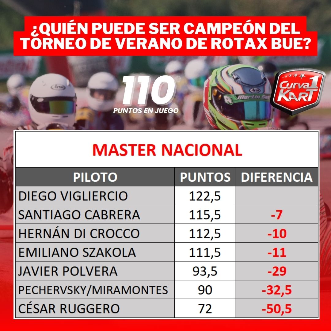 - 110 PUNTOS – Senior Nacional y Master Nacional (2 presentismo, 5 pole, 3 récord de vuelta, 45 cada final).