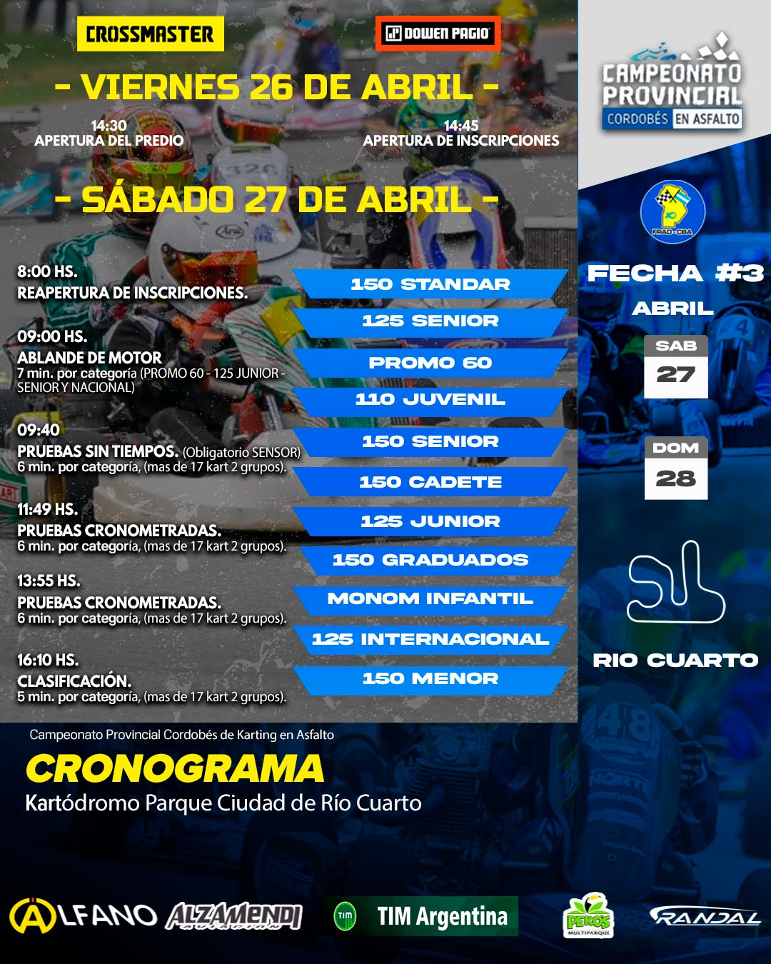 Tras su última parada en General Cabrera hace un mes, el campeonato regresa con más acción y adrenalina. Los horarios para el fin de semana son los siguientes: el viernes dará inicio a las 14:45 con la apertura de inscripciones, mientras que el sábado la actividad comenzará a las 08:00 horas. El sábado también contará con una tanda de ablande de motor a las 09:00, seguida de una tanda de pruebas sin tiempos a las 09:40. A partir de las 11:50 se llevarán a cabo dos tandas de pruebas cronometradas, culminando el día con las clasificaciones de todas las categorías a partir de las 16:10.
