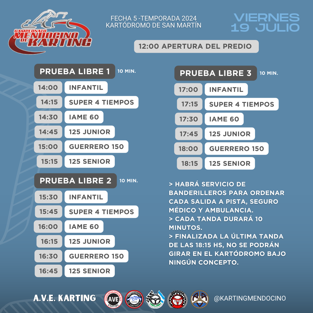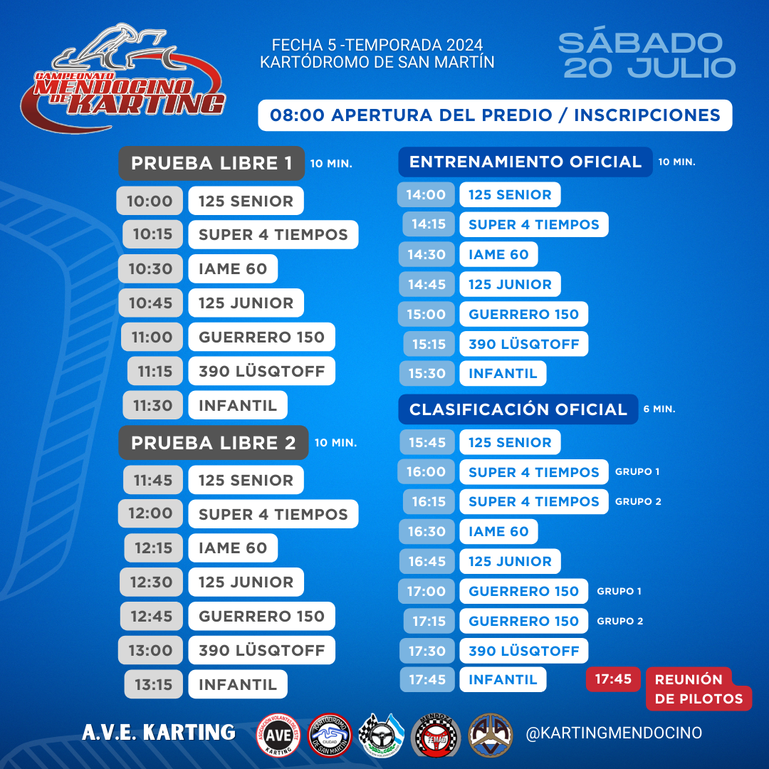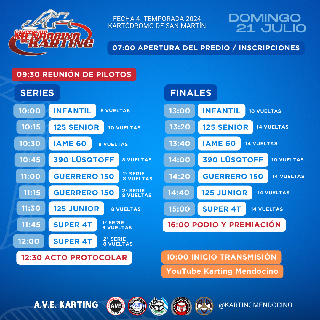 La fecha 4 comenzará este viernes con pruebas por categoría, mientras que el sábado se llevará a cabo la clasificación y domingo series y finales. Se corre por el circuito 4 horario de San Martín.