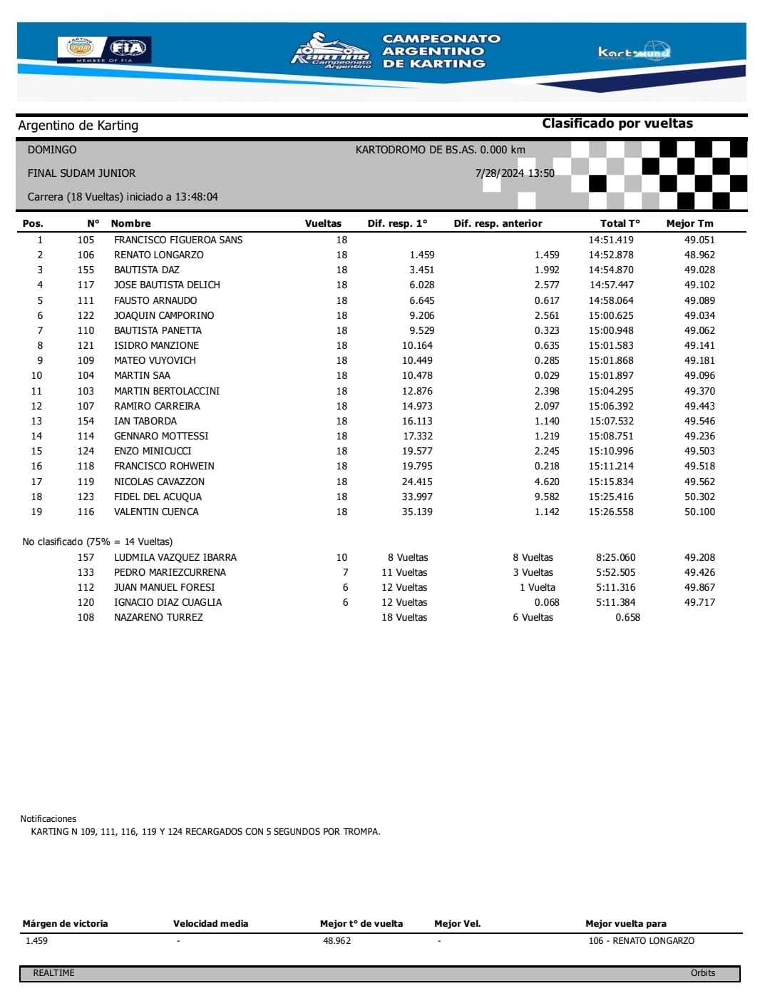 El escolta fue el misionero Renato Longarzo, que había cerrado el sábado con un vuelco. Fue 1-2 para el equipo Zaffaroni Kart y podio completo con para el motorista Fabián Martinelli, con la inclusión al podio del tucumano Bautista Daz, tras la sanción por trompa al cordobés Fausto Arnaudo, que de tercero pasó a quinto.