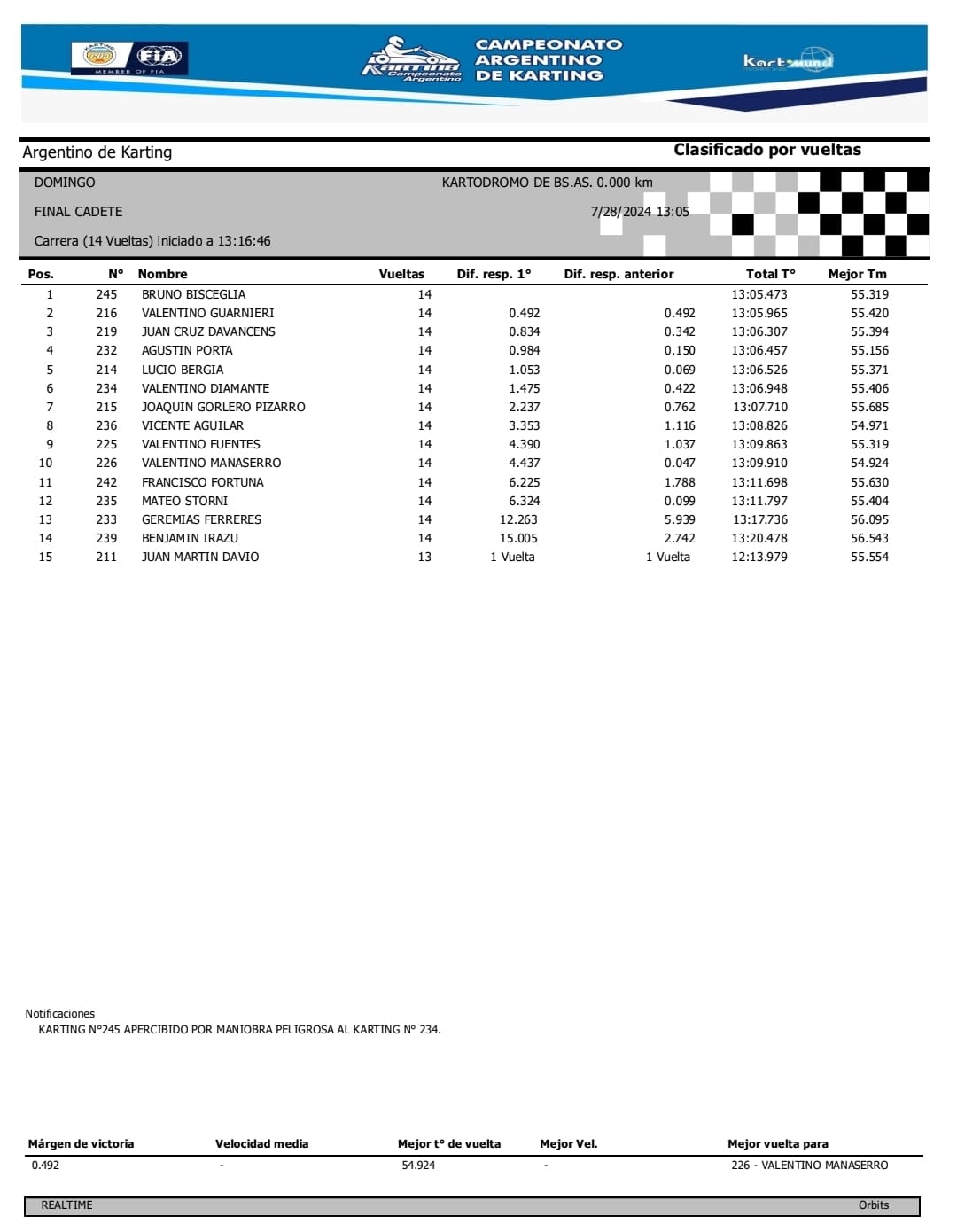 En lo deportivo, la mejor competencia la brindaron los pibes de la Cadete, con 5 nombres diferentes en la punta, decenas de sobrepasos para que recién en la última vuelta Bruno Bisceglia festejara su primera victoria nacional, con asistencia del AL Kart.