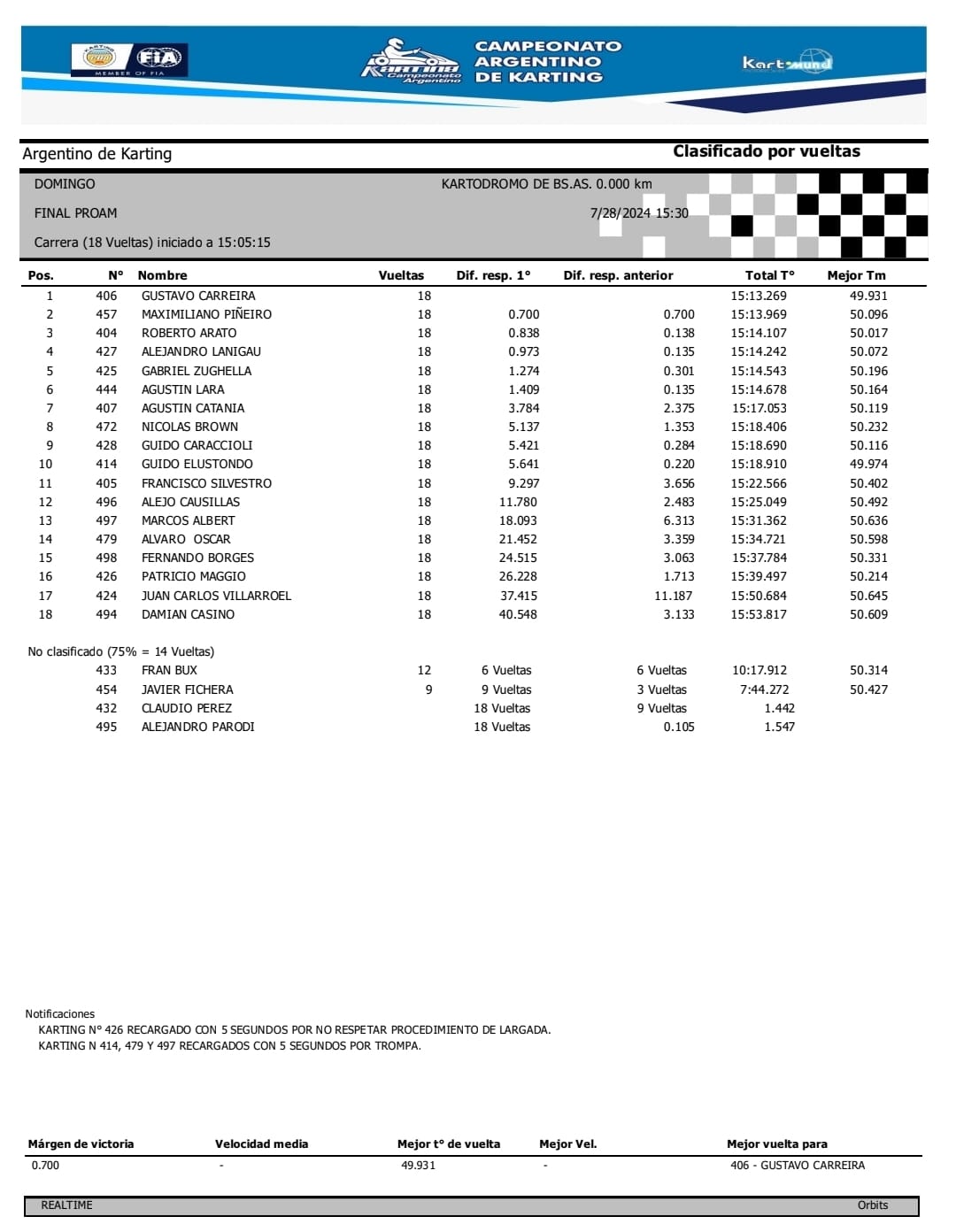 Cerró el espectáculo del Argnetino la clase Proam, con triunfo del pilarense Gustavo Carreira (Zaffaroni Kart / Martinelli Motorsport), que doblegó primero el rionegrino Alejandro Lanigau (terminó cuarto) y luego se recuperó de Guido Elustondo que estuvo por momentos adelante. Sobre el final, aguantó bien al BirelART de “Tito” Arato que finalmente fue tercero.