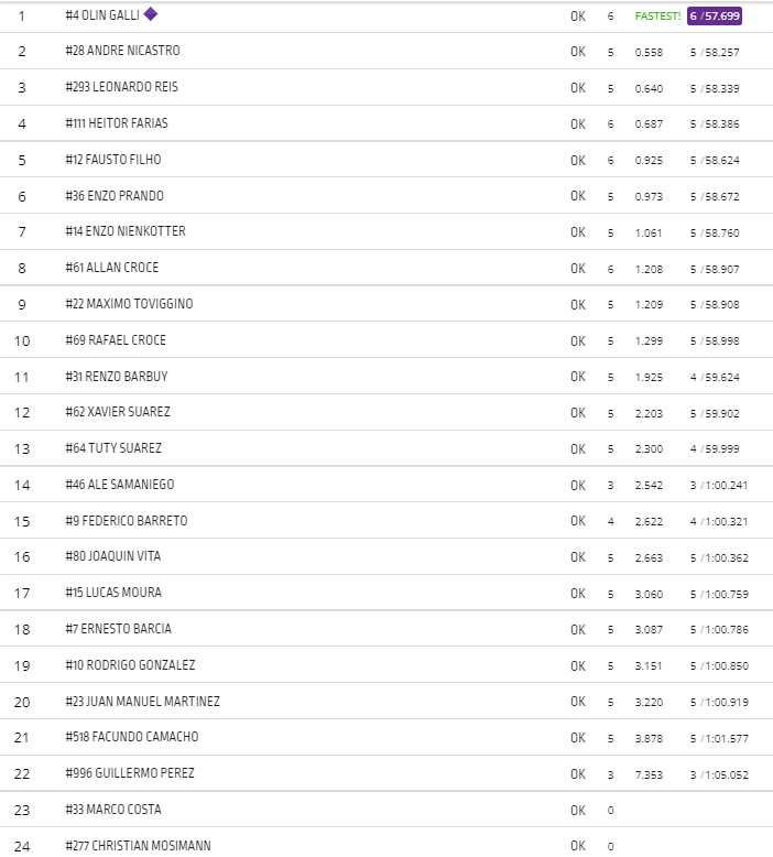El multicampeón brasilero Olin Galli marcó la pole en OK y Renzo Barbuy marcó el 11° mejor tiempo, pero por la exclusión de Toviggino (que había sido noveno) quedó 10° entre los 24 presentes, con atención del equipo D-Racing y manejando un chasis Tony Kart. Renzo había sido 12°, 13° 14° y 6° en las prácticas.