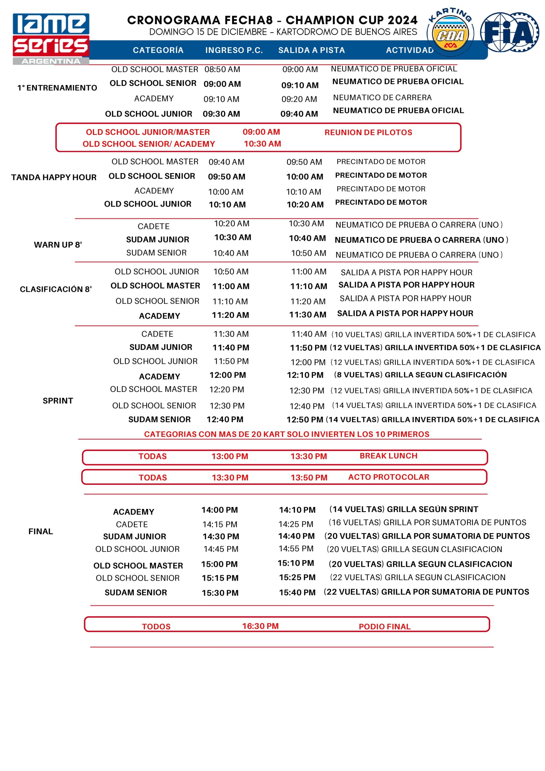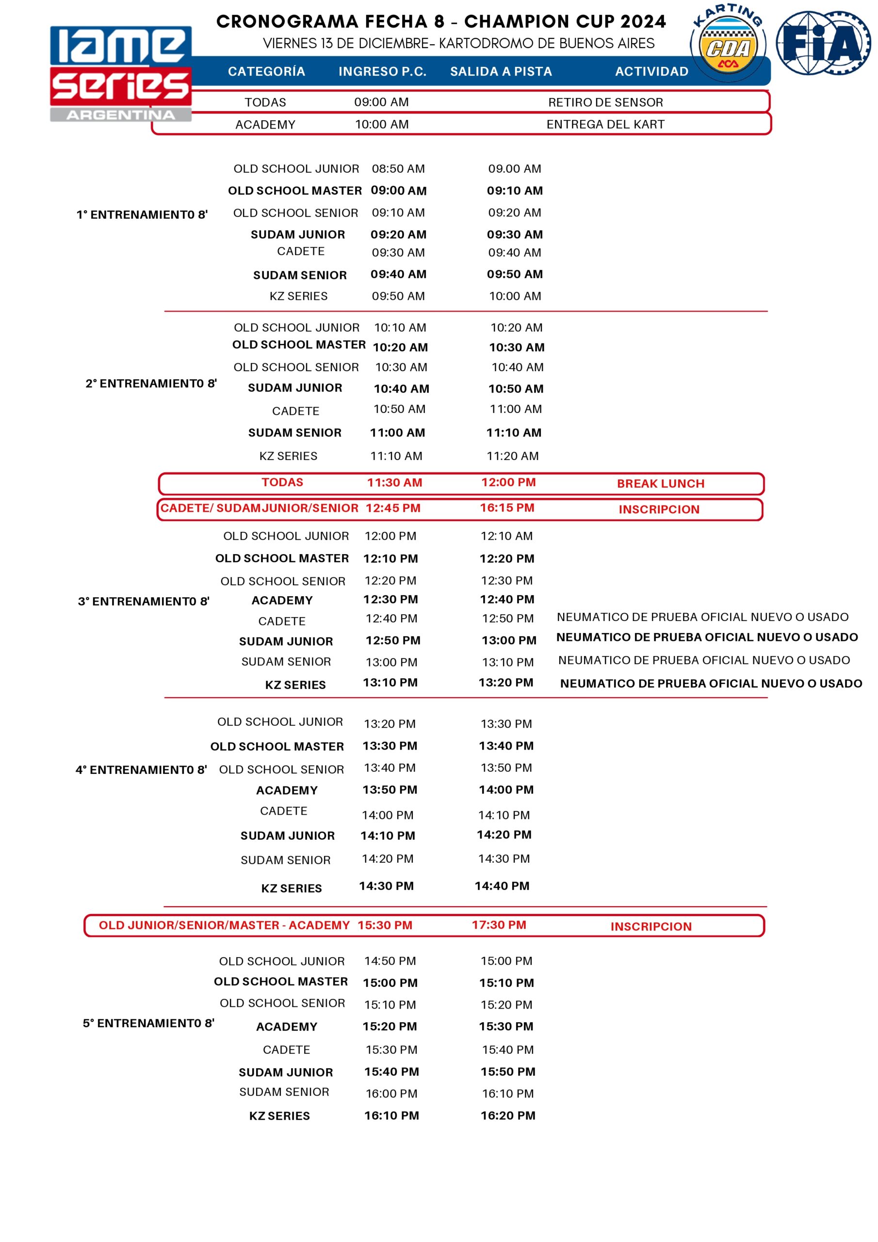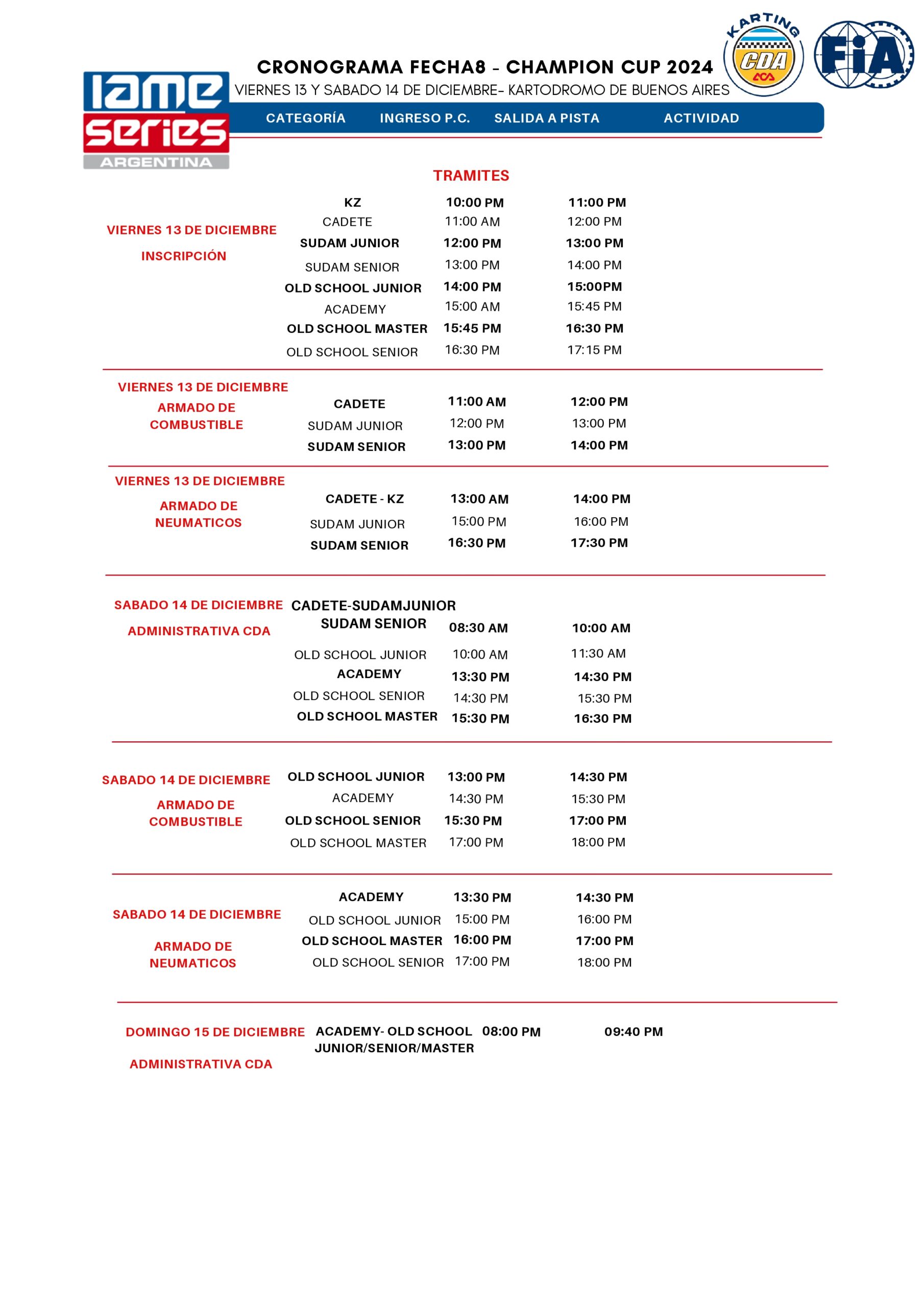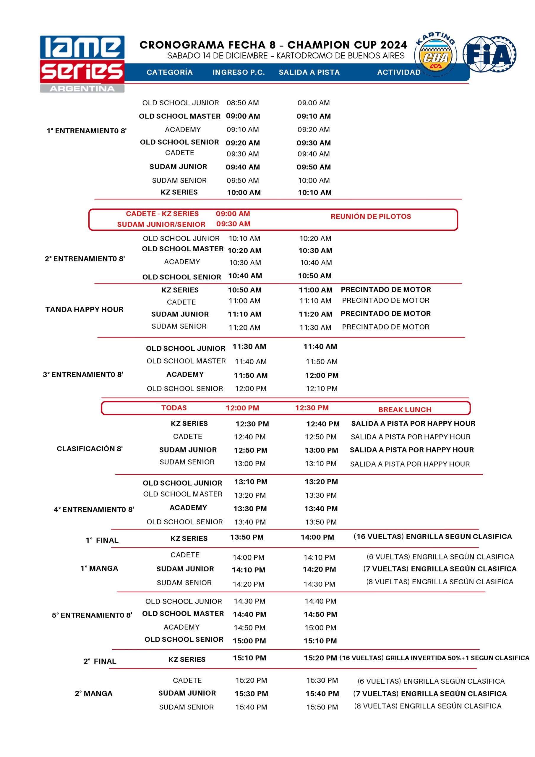 Estarán en pista las categorías Cadete, Academy, Sudam Junior, Sudam Senior y las Old Junior, Senior y Master. Se suma a la programación KZ Series y sigue ausente la Proam, que estuvo durante los 6 eventos de la etapa regular, pero no en las 2 fechas de la Copa de Oro.