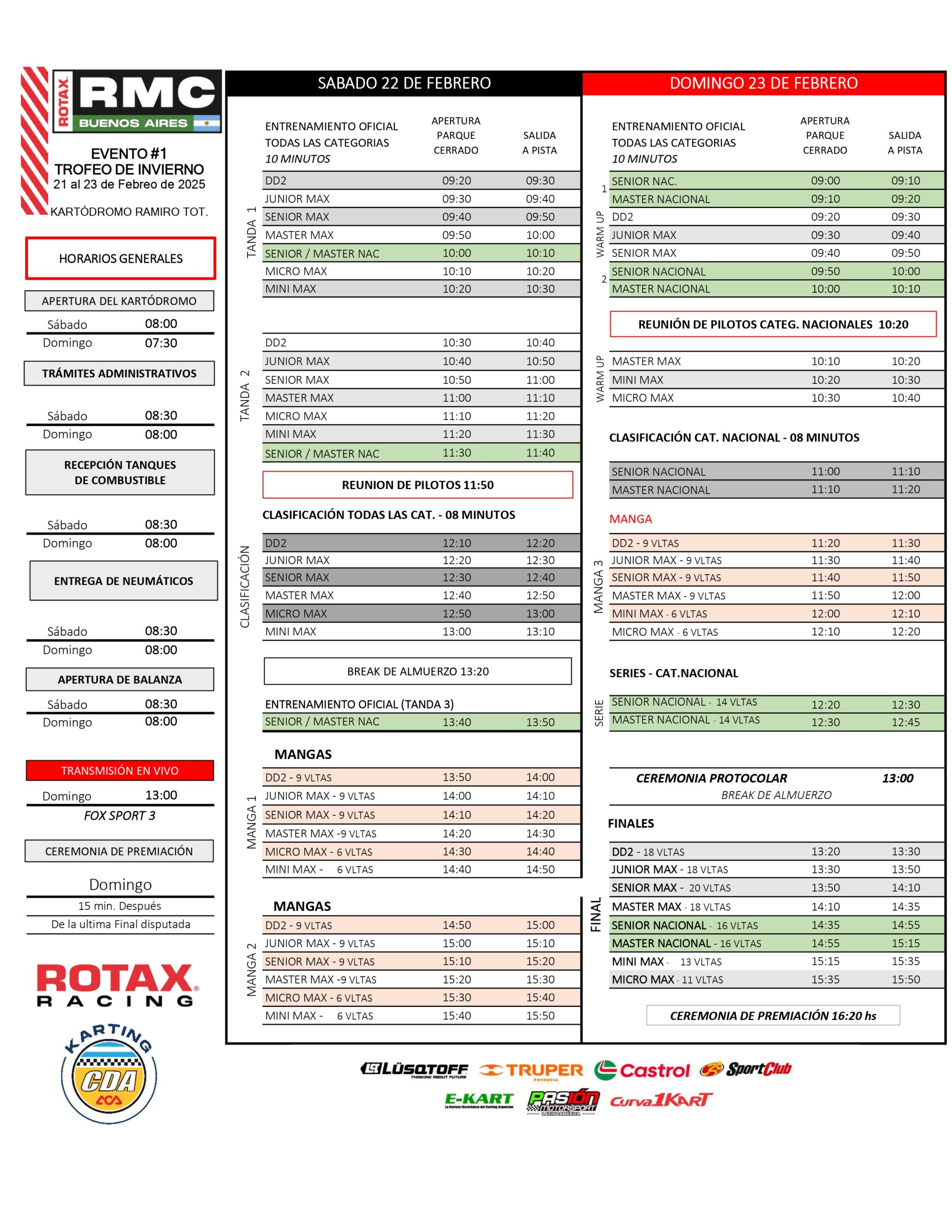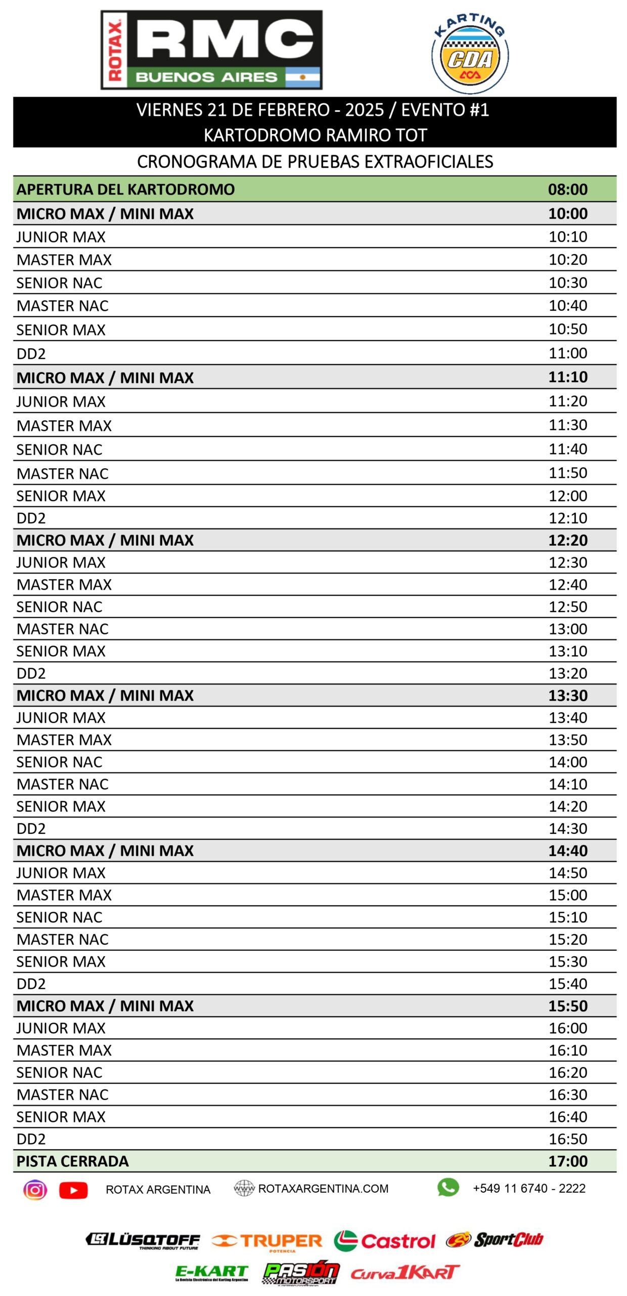 La programación no cambia: VIERNES de prácticas ordenadas por categoría, SÁBADO de qualy y 2 mangas, cerrando el DOMINGO con las terceras mangas y finales, más actividad completa de las “nacionales.