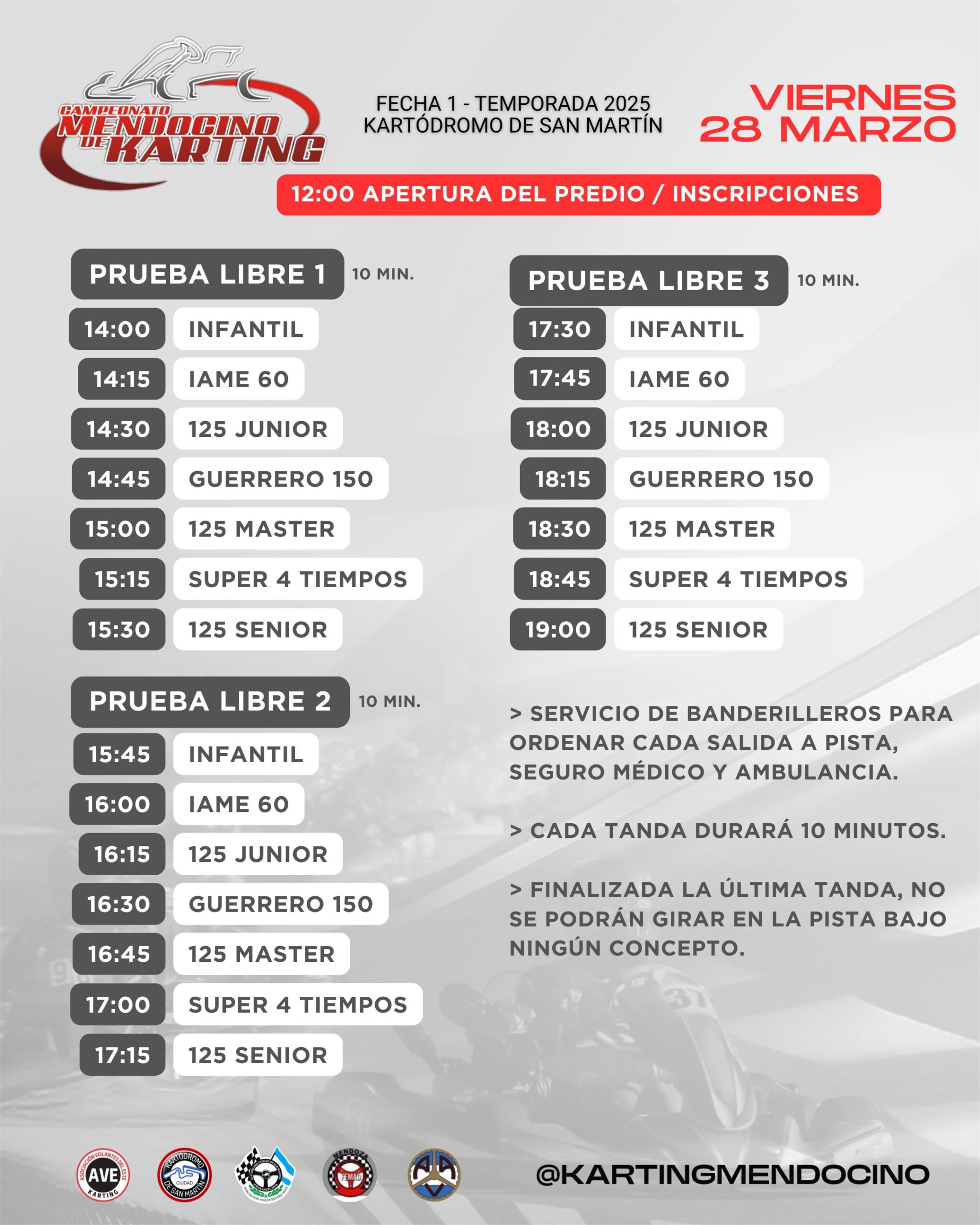 Desde el martes 25 al jueves 27 el kartódromo estará cerrado por obras, por tanto recien el VIERNES 28 se podrá girar en las 3 tandas programadas luego del mediodía.