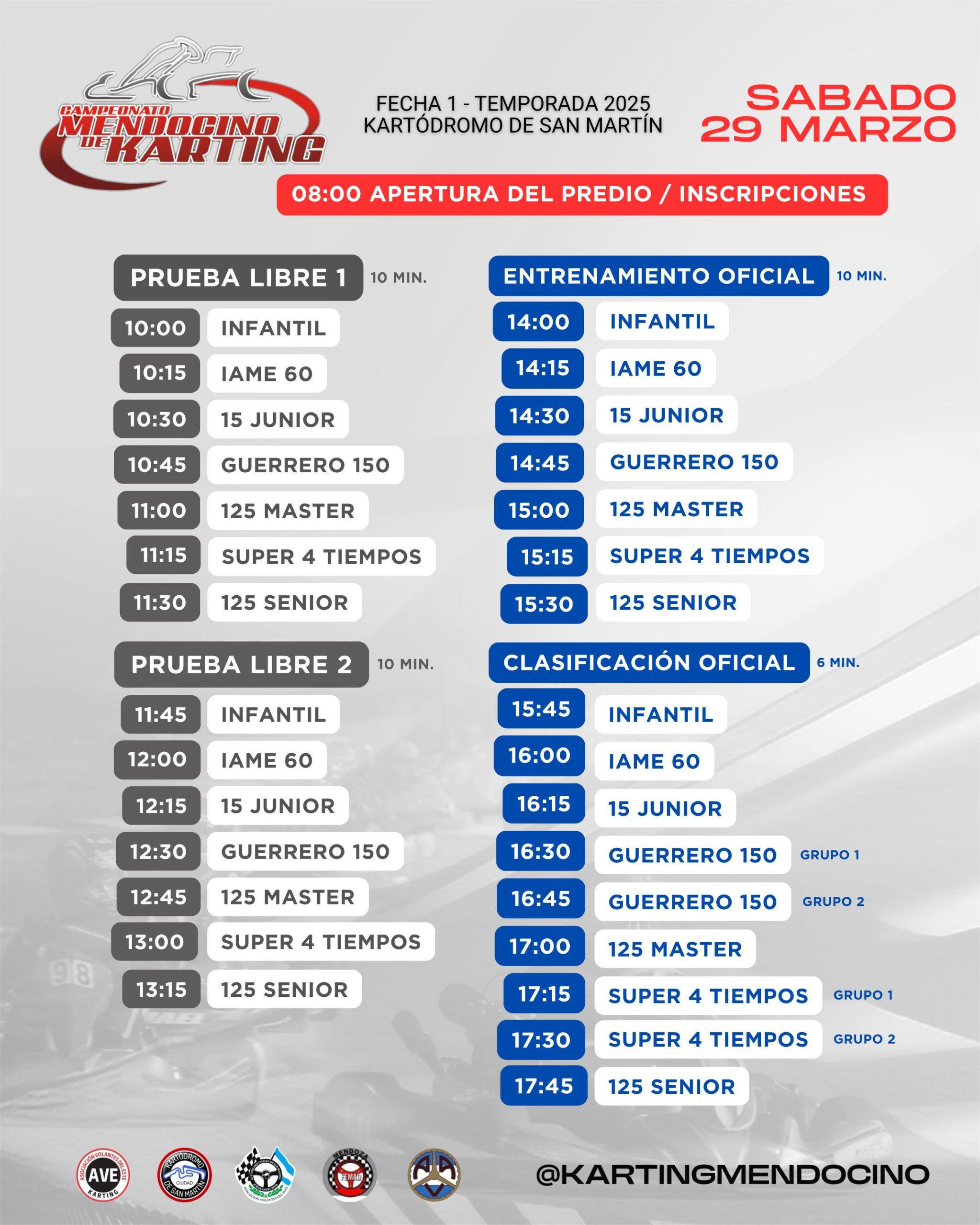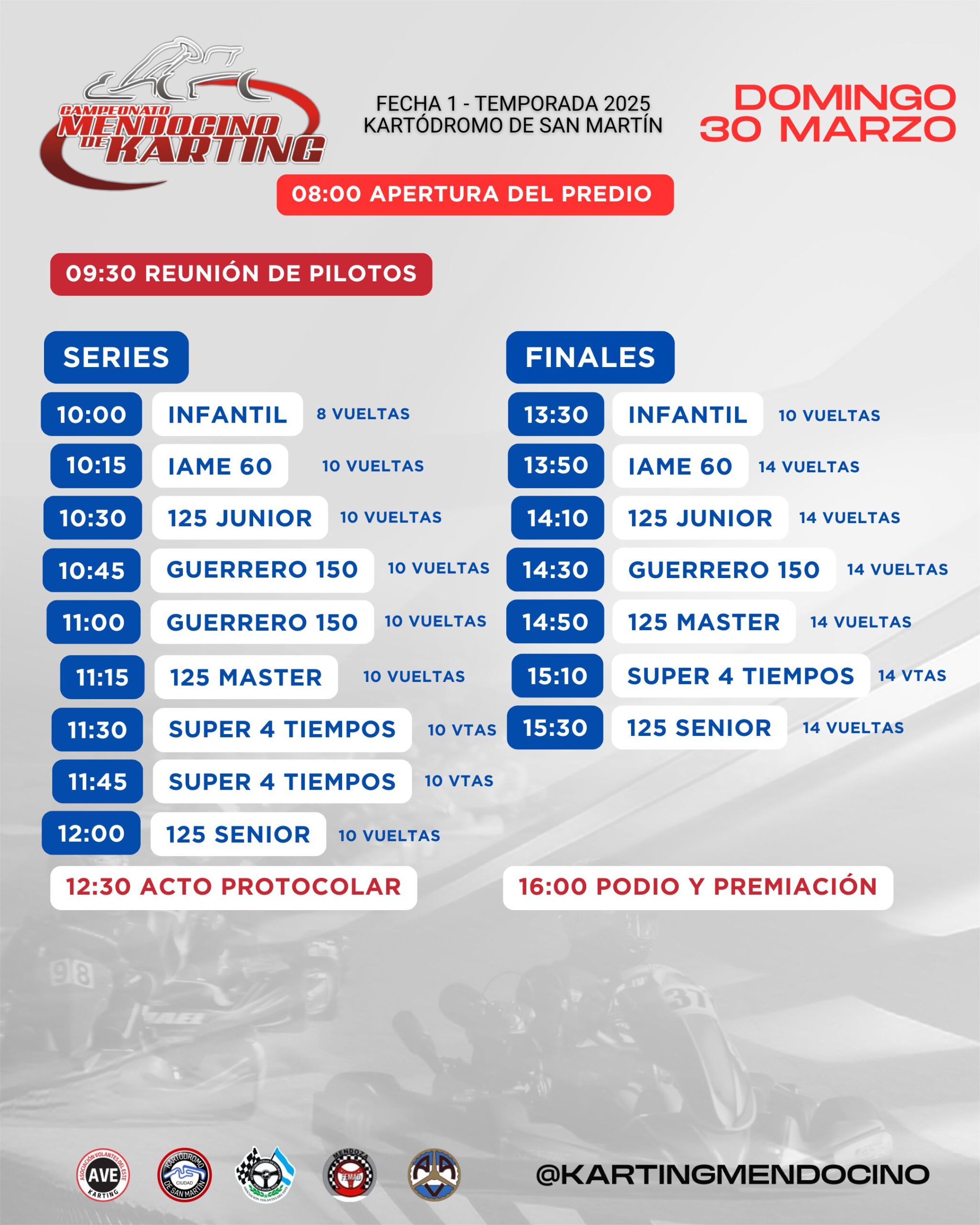 - Categorías PROMOCIONAL IAME 60, GUERRERO 150, SUPER 4 TIEMPOS, 125 JUNIOR, SENIOR Y SENIOR MASTER