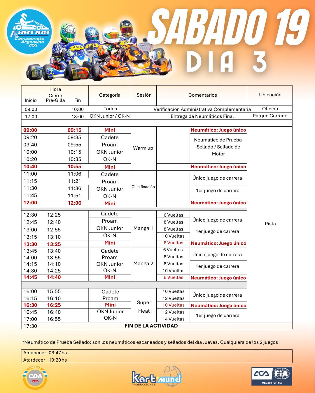 La novedad principal es que jueves y viernes serán estrictamente para entrenamientos. El sábado se realizará la clasicación, 2 manga y super heat, restando para el domingo las 5 finales.