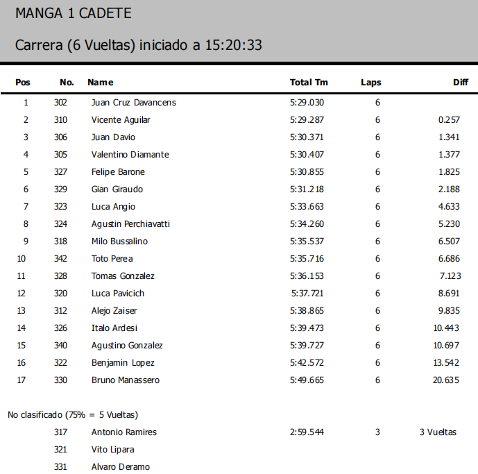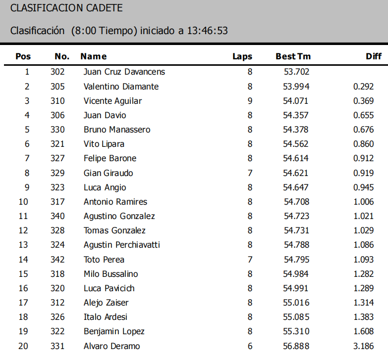 Juan Cruz Davancens (Ibarra Competición) se llevó la pole y manga en CADETE, luego de una intensa lucha y varios sobrepasos con el neuquino Vicente Aguilar (Cronos Racing Team).