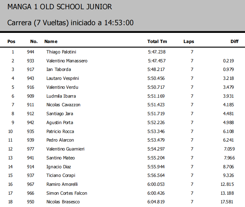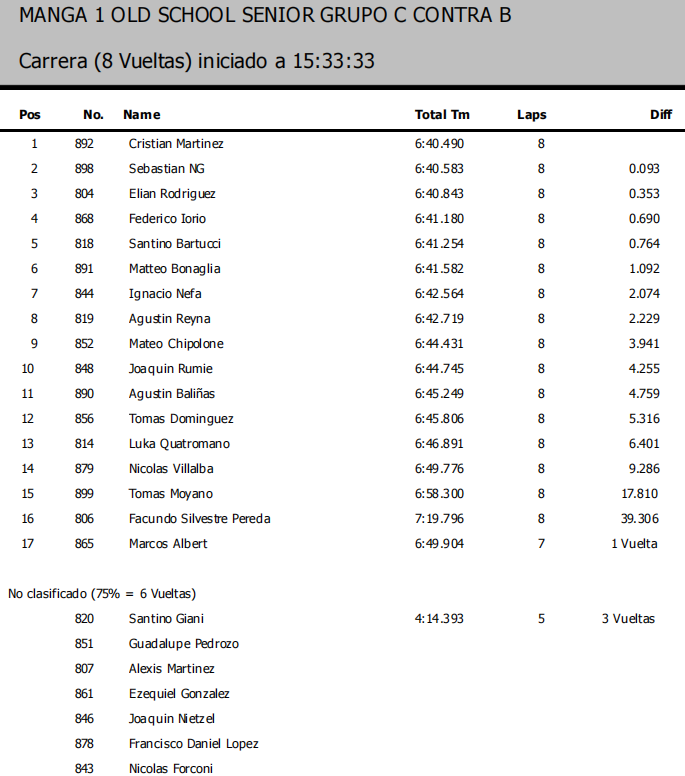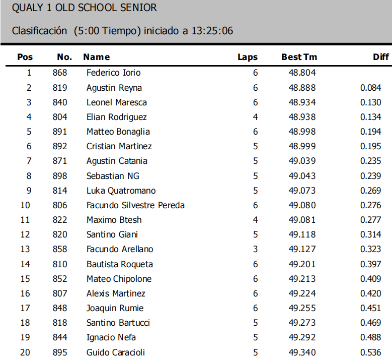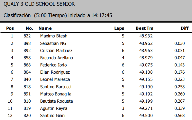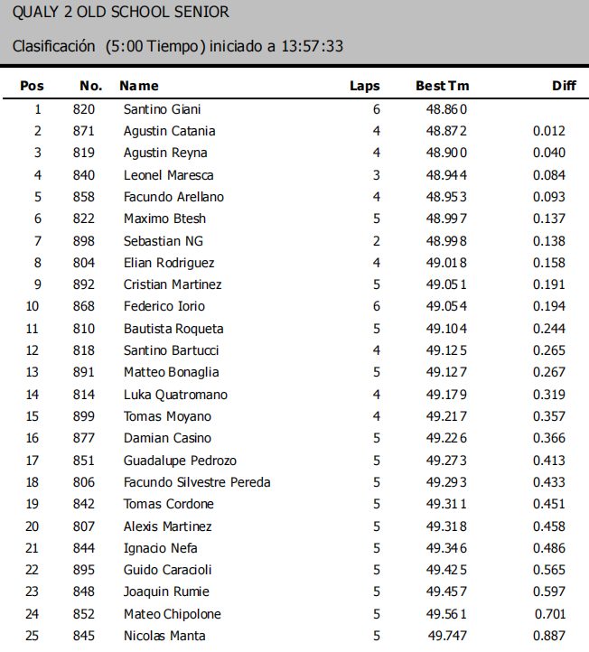 Por primera vez desde que existe IAME Series Argentina una de sus categorías Old School Senior llegó a 38 karts, obligando a superarla en “pares e impares” para sus prácticas. Usaron clasificación estilo F1 (Q1, Q2 y Q3) cerrando la pole position con 4 pilotos en 47 milésimas. Apretadísimo! Por esta cantidad de pilotos, se formaron los grupos A, B y C donde se cruzan todos contra todos. El domingo habrán 2 sprint y 1 final, donde 2 pilotos quedaran afuera, ya que por reglamento solo se admiten 36 pilotos en la grilla.