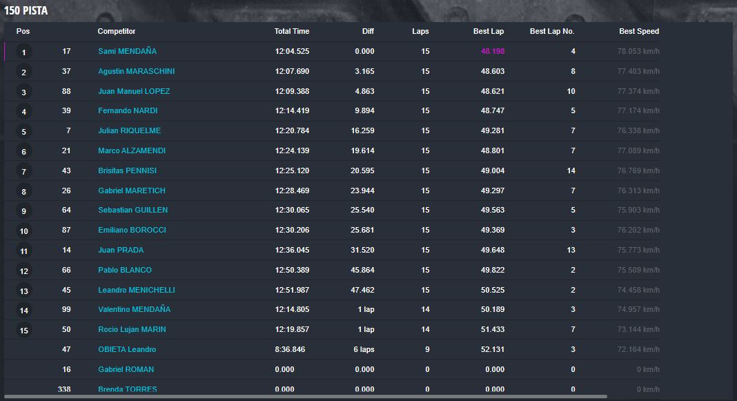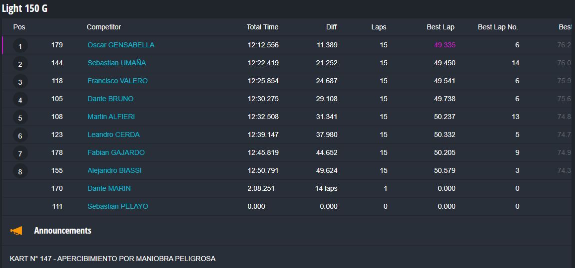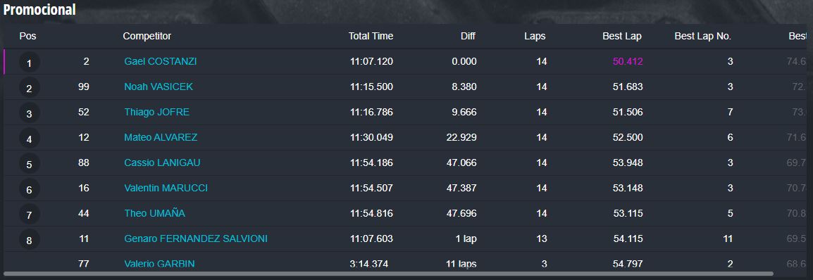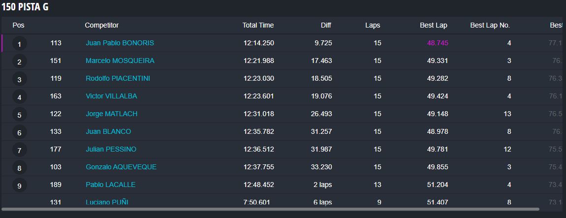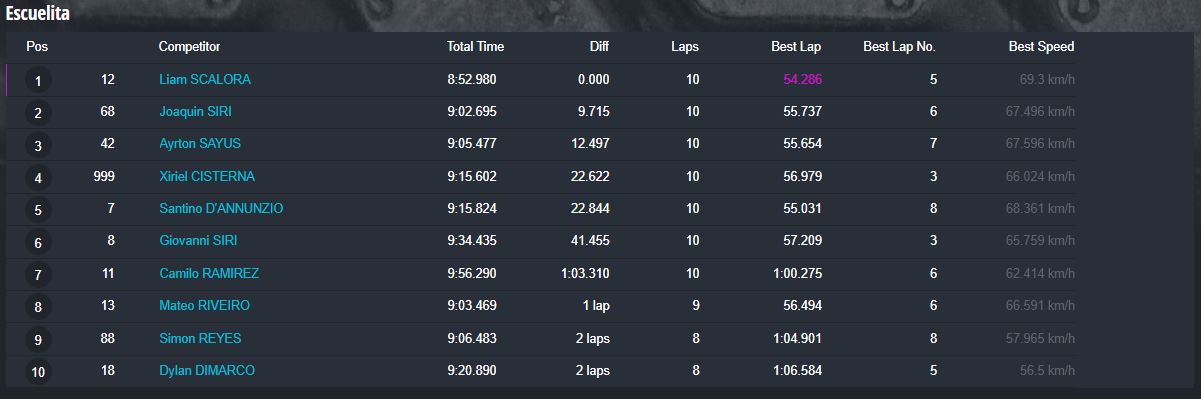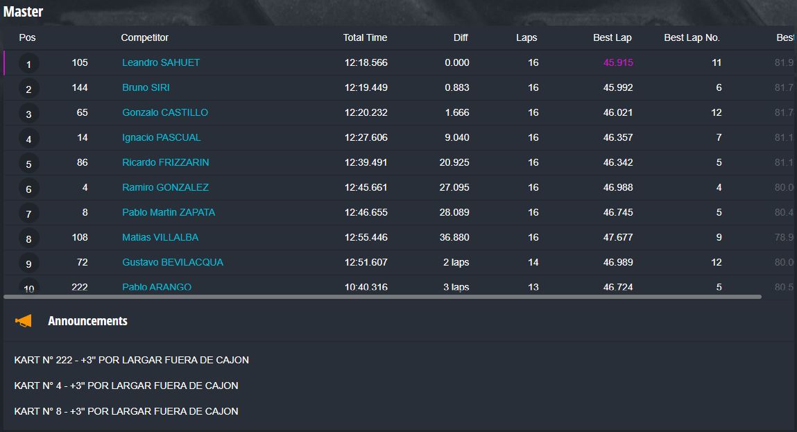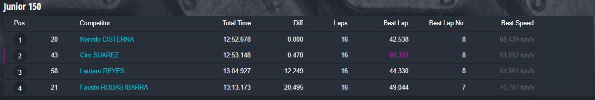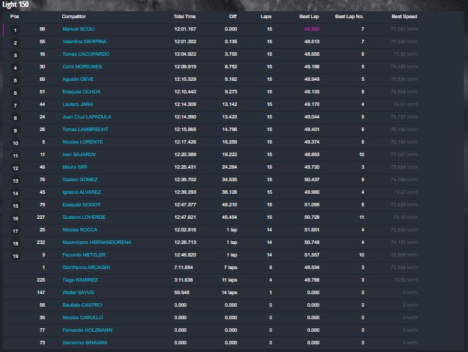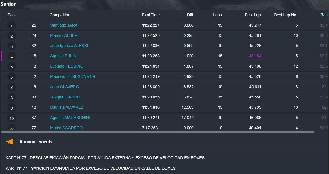 En la categoría más importante, la Súper Sudam Senior el primer puesto fue para Santiago Jara, con los tres pilotos del podio separados por apenas milésimas de segundos, ya que Marcos Albert terminó segundo a 298 milésimas de la punta y Juan Ignacio Alessi tercero a 659ms del ganador.