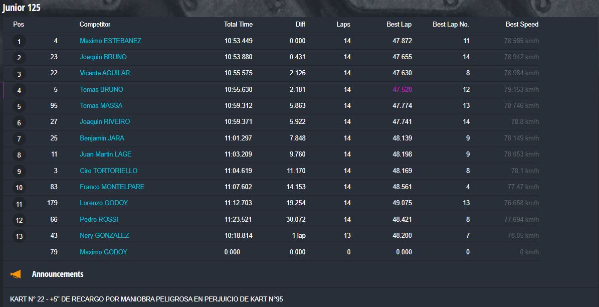 En Super Sudam Master, el triunfo fue para Leandro Sahuet, mientras que Sami Sendaña ganó en 150 Pista, Máximo Estebanez en Junior 125, Neredo Cisterna en Junior 150, Manuel Scoli en Light 150, Walter Estebanez en Varilleros, Liam Scalora en Escuelita y Gael Costanzi en Promocional.
