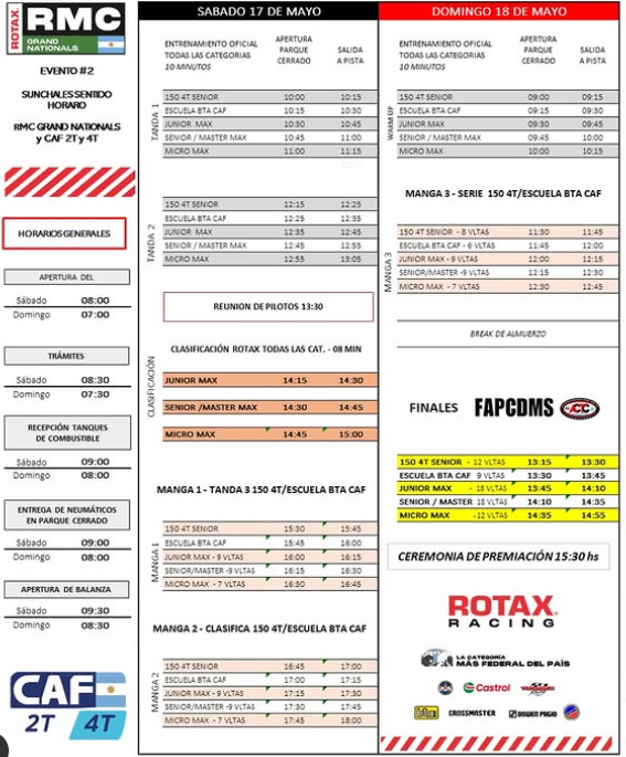 • Domingo 18 de mayo: se disputará la 3ra manga de RMC GN y se desarrollarán la clasificación, serie y final del CAF.