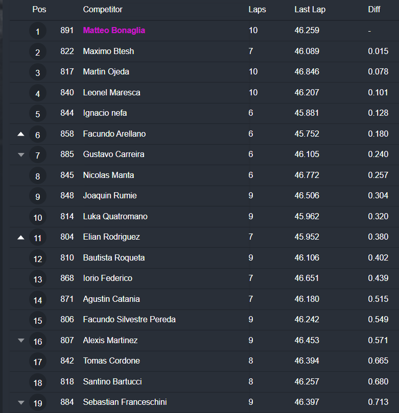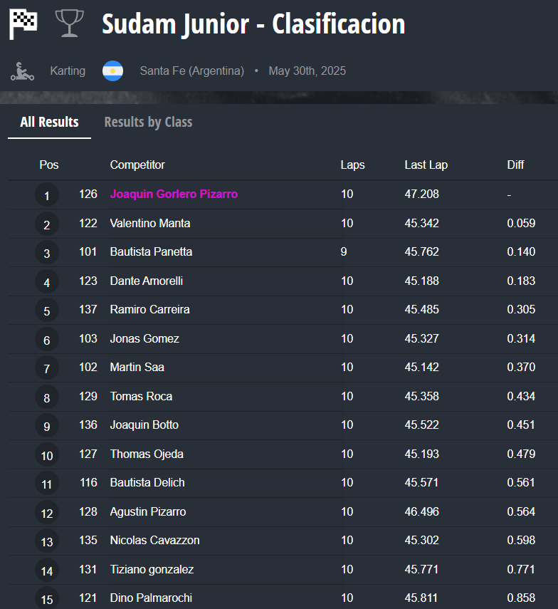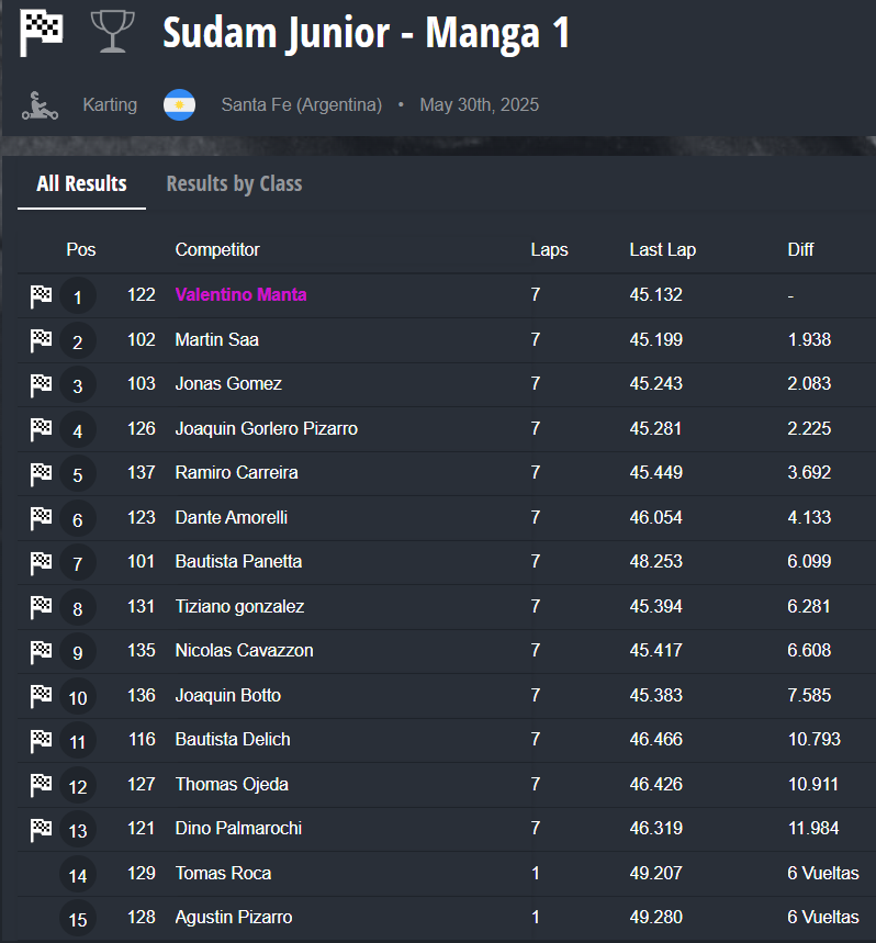 Joaquín Gorlero Pizarro se llevó la pole y Valentino Manta se quedó con la única manga del sábado. Martín Saa avanzó para ser segundo y detrás terminó Jonás Gómez.