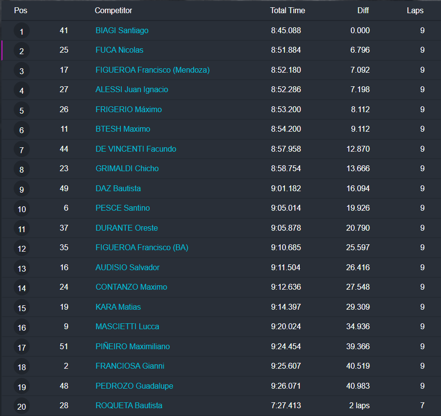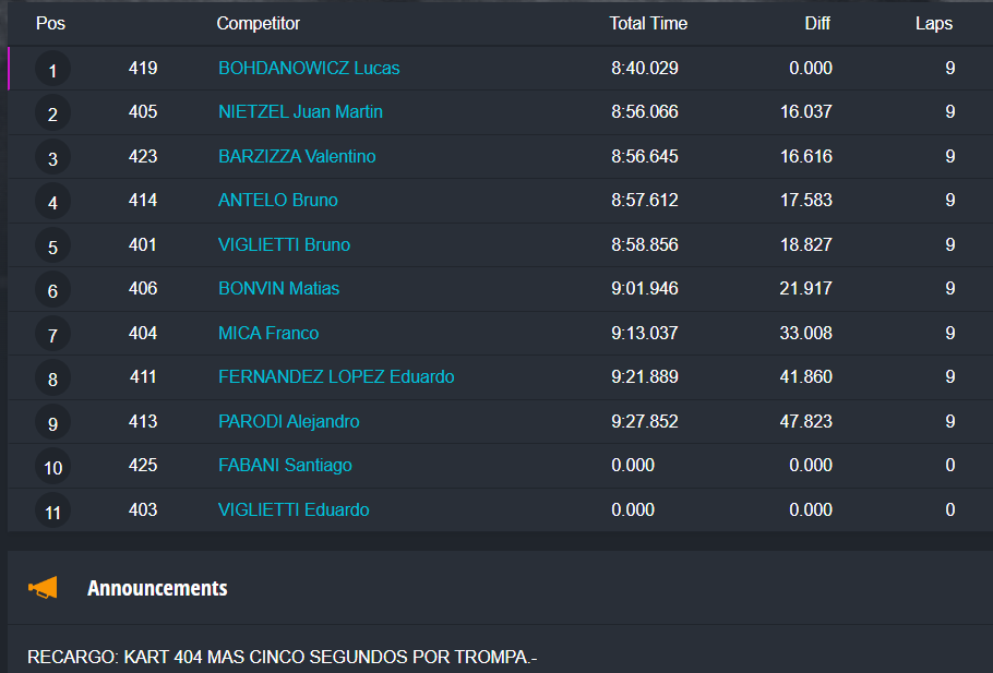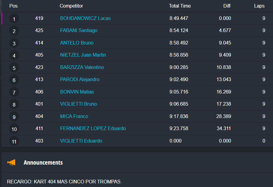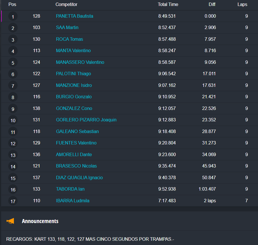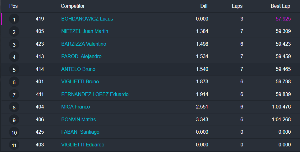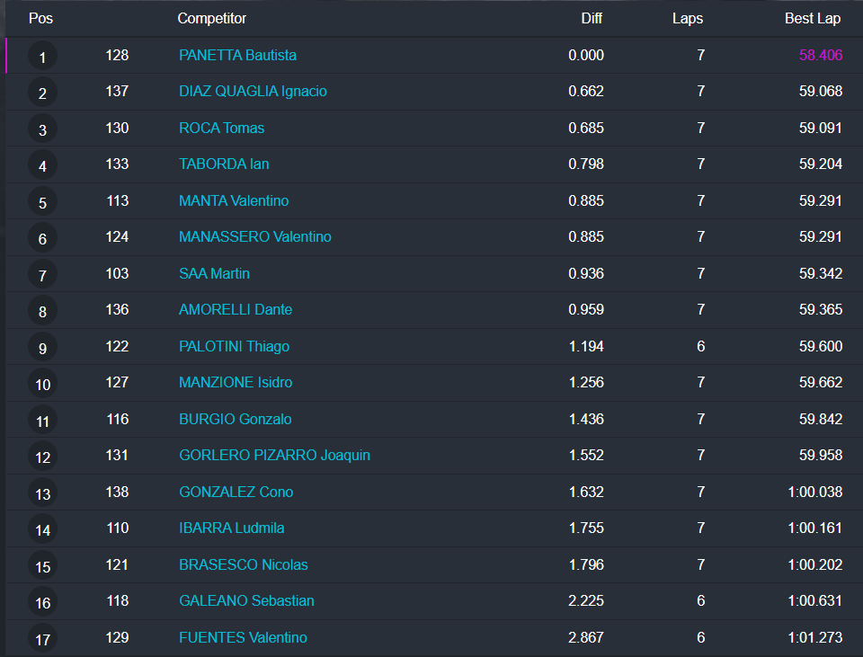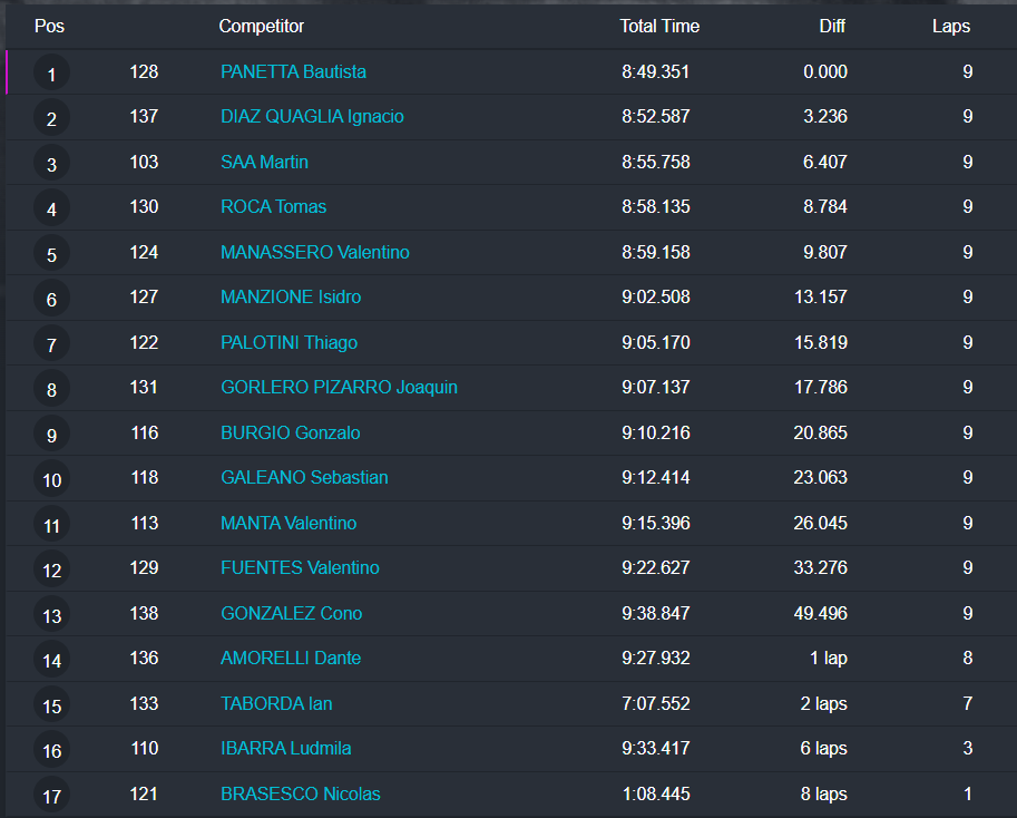 La noticia del día fue la consagración anticipada de Bautista Panetta en Junior Max, que es el nuevo Campeón luego de sumar los puntos de la pole position y ganar las dos mangas. Panetta es el cuarto campeón anticipado, junto a Gabriel De Lucca (Master Max), Matías Rodríguez (DD2) y Diego Vigliercio (Master Nacional).