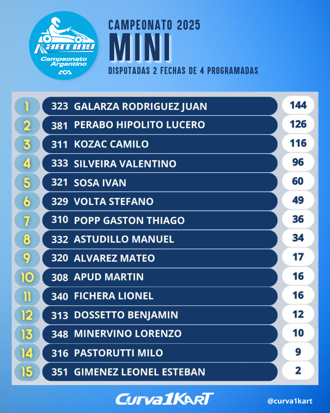 El marplatense JUAN GALARZA liderá la Mini con 144 puntos, seguido por el mendocino Hipólito Lucero (Pancho Toujas) que viene de ganar en su provincia. Tercero marcha el pampeano Camilo Kozac.